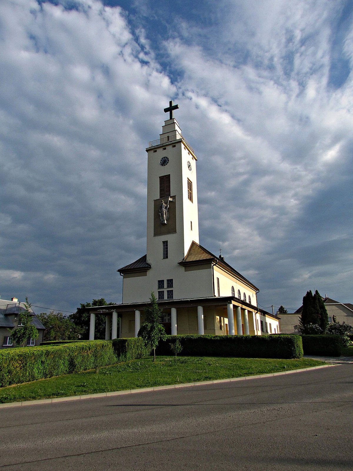 Na východní straně chrámu nás u silnice jistě zaujme i pěkná kamenná socha Panny Marie s Ježíškem, obklopená parčíkovou úpravou.
