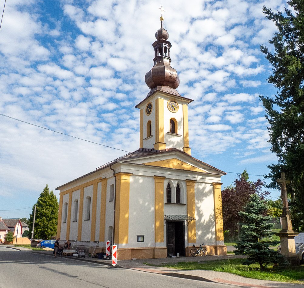 Jde o konstrukci na obdélníkovém základě s mírně ustupujícím presbytářem rovně s pravoúhlou základnou. Nad vstupem je hranolová věž se střechou s bání (nová z r. 2022). Střecha lodi je sedlová se skloněnými čely. V současné době se vnějšek skví novou hladkou omítkou s lesénami, která nahradila socialisticko-realistický břizolit z roku 1973. Spodní část obvodových zdí dostala letos (2025) i nový pískovcový obklad (viz foto).