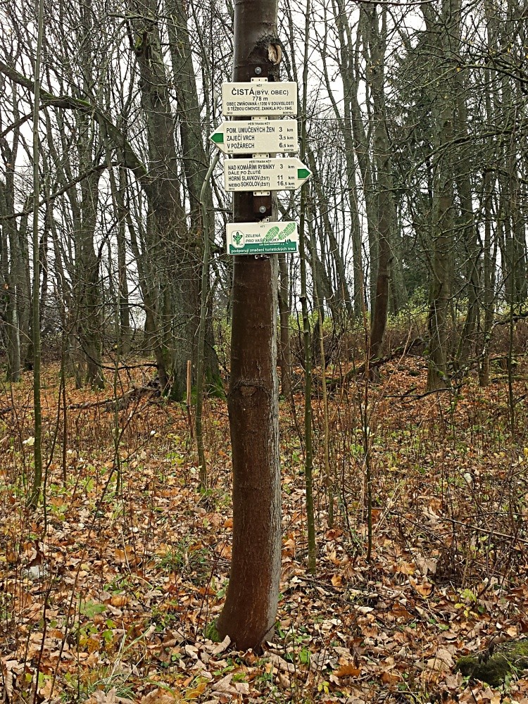 Rozcestník stojící v lesíku u odbočky silnice ze směru Sokolov - Krásno na Prameny v místě bývalé obce Čistá, označuje směr zeleně značené turistické cesty, která touto křižovatkou prochází. Zelená turistická trasa sem přichází od jihu z místa zvaného V Požárech okolo památníku Pochodu smrti a směřuje dál směrem severním ke Komářím rybníkům. Obec Čistá, která stála v okolí zdejšího rozcestí, byla na jaře roku 1946 začleněna do vojenského výcvikového prostoru a později zcela zničena. Více o Čisté zde.