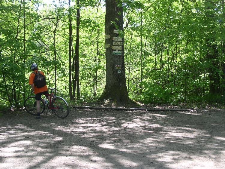 Křížení ZTZ ČTZ a ŽTZ na hrázi u Nové řeky. Značky vedou do Chlumu u Třeboně, Stráže nad Nežárkou a ve dvou verzích do Třeboně. Na okolních hrázích jsou vysazeny duby. Podle jejich mohutnosti pamatují stavbu tohoto kompexu hrází a kanálů v 16. století.
