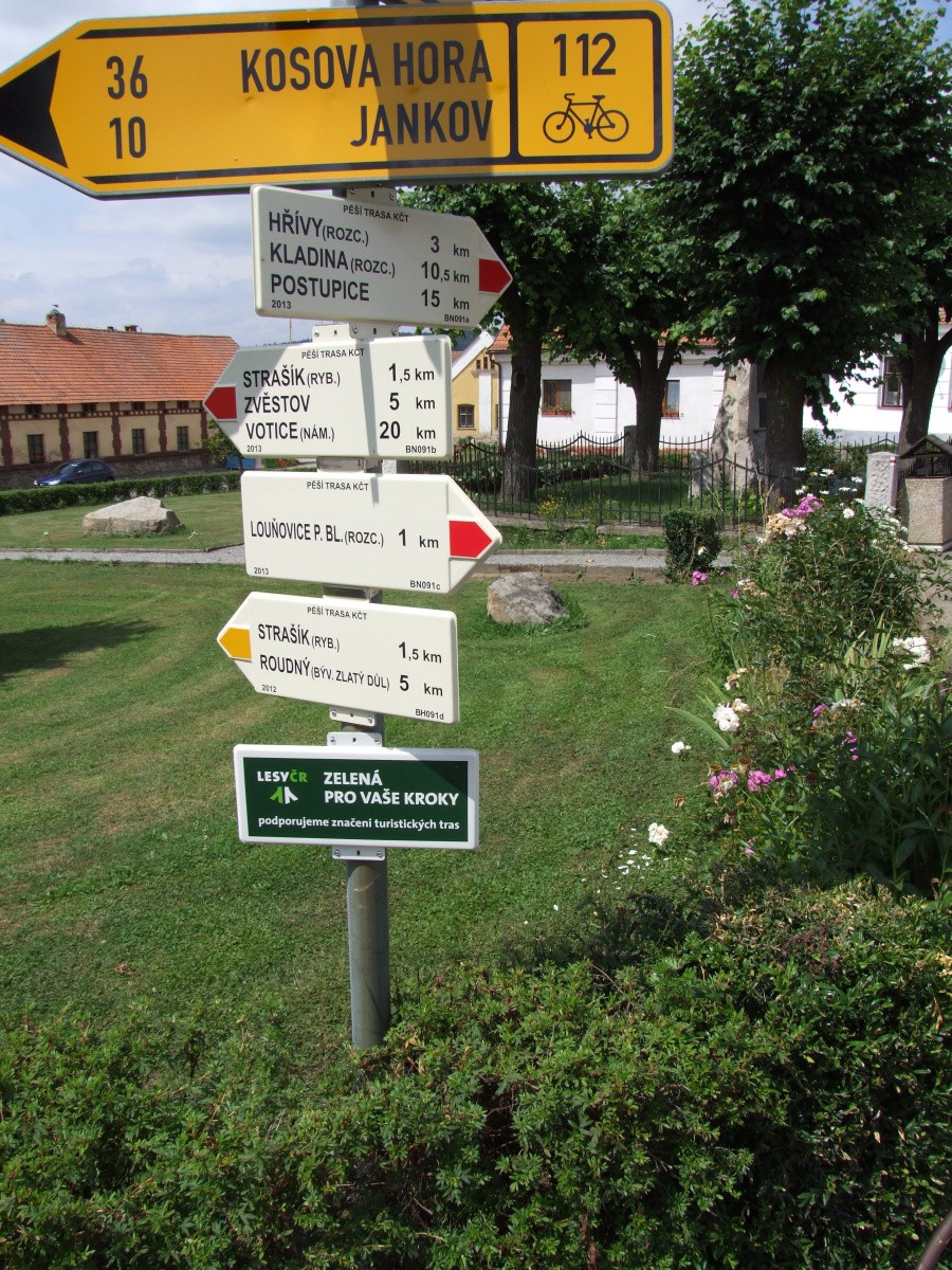 Turistický rozcestník stojící v malém parku na náměstí Jana Žižky v Louňovicích pod Blaníkem upřesňuje směry červeně a žlutě značených turistických tras. Červené trasy se zde na náměstí v Louňovicích scházejí hned tři. Jedna sem směřuje přes Velký Blaník od Vlašimi. Druhá přes Postupice od Benešova a poslední ze západu z Votic. Žlutě značená turistická trasa do Louňovic pod Blaníkem přichází od jihozápadu od vrchu Vinice z areálu bývalého zlatého dolu Roudný. Navíc se také v Louňovicích kříží několik cykloturistických tras, která maji na rozcestníku také své směrové šipky.