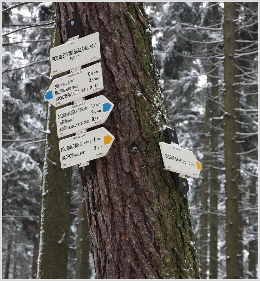 Rozcestí Pod Blednymi skalami (foto 1 a 2) vzniklo až v roce 2008 v rámci vyznačení přímé trasy (žlutá značka) z Machova (foto 3) ke vstupu do polských Blednych skal (foto 4 a 5). Modrá značka odtud vede pod Bor (foto 6 – výhled z Boru, na vrchol odbočuje z modré trasy vrcholová značka), zpět do Machova a přes Machovskou Lhotu na česko-polskou hranici. Na druhou stranu jde modrá značka na plošinu s nádherným výhledem u Bukowiny Klodzke (foto 7 a 8), sestupuje do Pstražne a vrací se na české území u Závrch, kde vyúsťuje na červenou značku z Machova do Hronova (foto 9). Tato modrá značka je rovněž vedena od roku 2008 nově, starší mapy současný stav proto nezachycují. Z tohoto důvodu přikládám do galerie mapu generovanou v programu Turistické trasy (http://www.trasy.net/).