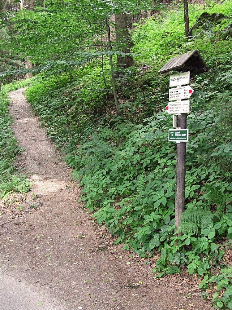 Rozcestník stojící u silnice č.288 z Železného Brodu na Bozkov označuje křižovatku modré a červené turistické stezky. Modře značená trasa má svůj počatek kousek odtud u soutoku Jizery a Kamenice u železniční zastávky a pokračuje od silnice do kopce po lesní cestě. Přes obec Spálov míří modře značená trasa okolo Myší skály, vrcholu Medence a Sejkorské kapličky až do centra města Semily. Červená trasa odtud jižním směrem směřuje také do Semil, ale trasou v údolí proti proudu řeky Jizery přičemž kopíruje známou Riegrovu stezku. Naopak severním směrem červená značka vede údolím proti proudu řeky Kamenice až k zámku Návarov.