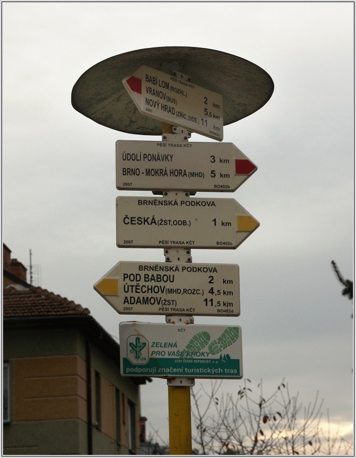 červená z Brna-Mokré hory podél Ponávky přes Lelekovice, Babí lom (foto 4 – 6), Vranov, Nový hrad, Olomučany a Rudice (foto 11)