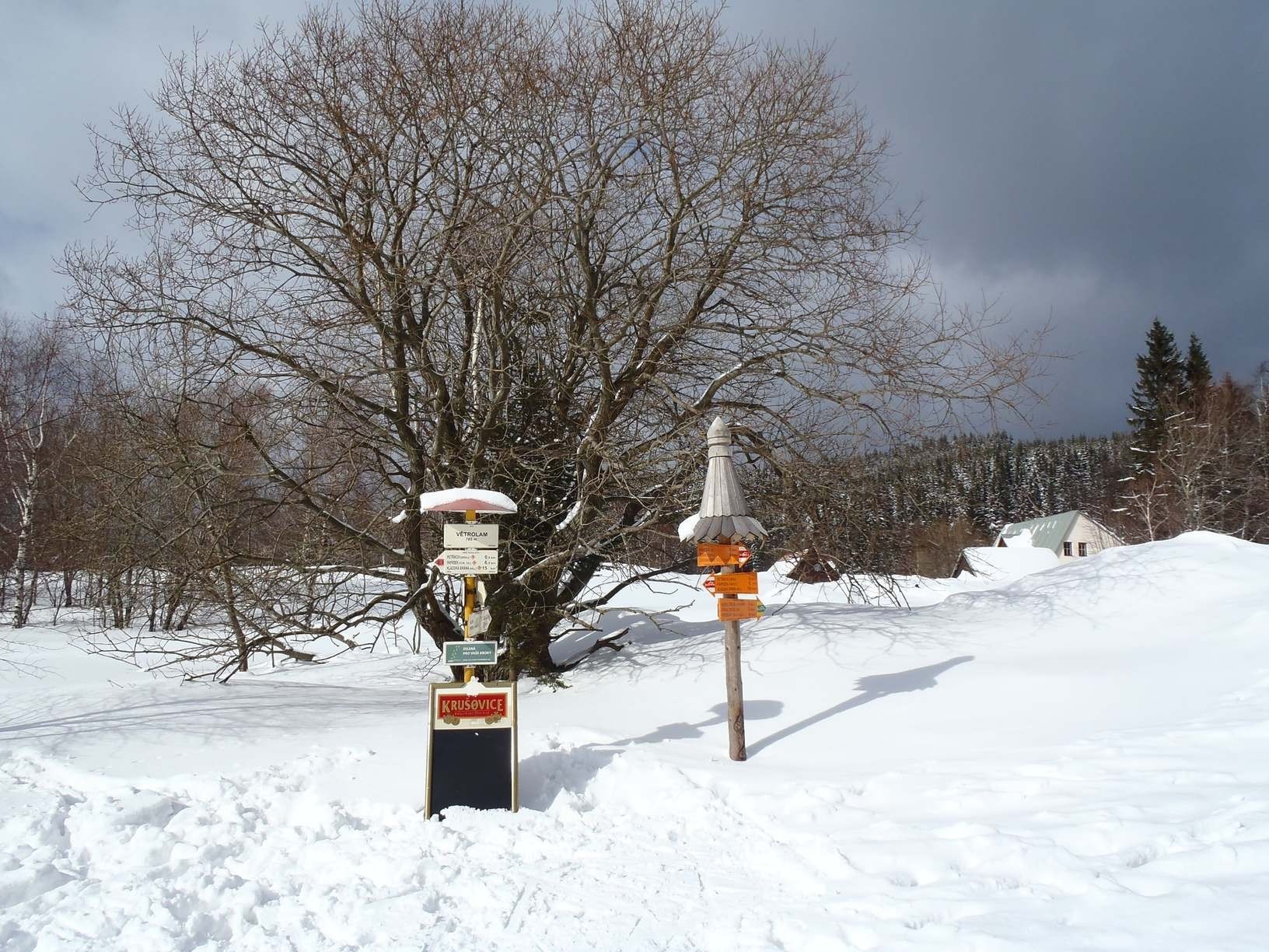 Turistický rozcestník se nachází poblíž skiareálu Pod Klínem u Apartmánů Ramzová.