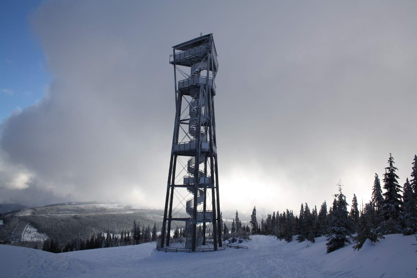 Tento případ byl také, když jsem šel od hotelu Energetik na Hnědý vrch. V lese jsem uviděl, že tudy jezdí snowboardisté a lyžaři a tak jsem se tudy vydal. Kdybych měl sněžnice nebo návleky, tak by to ještě šlo. Ale nakonec se dobrá věc podařila a já jsem se ocitl v nadmořské výšce 1.207 metrů. Moc klidu mne zde nevítá. Těsně vedle rozhledny končí čtyřsedačková lanovka, která je v tuto dobu hojně využívána lyžaři, snowboardisty i běžkaři.