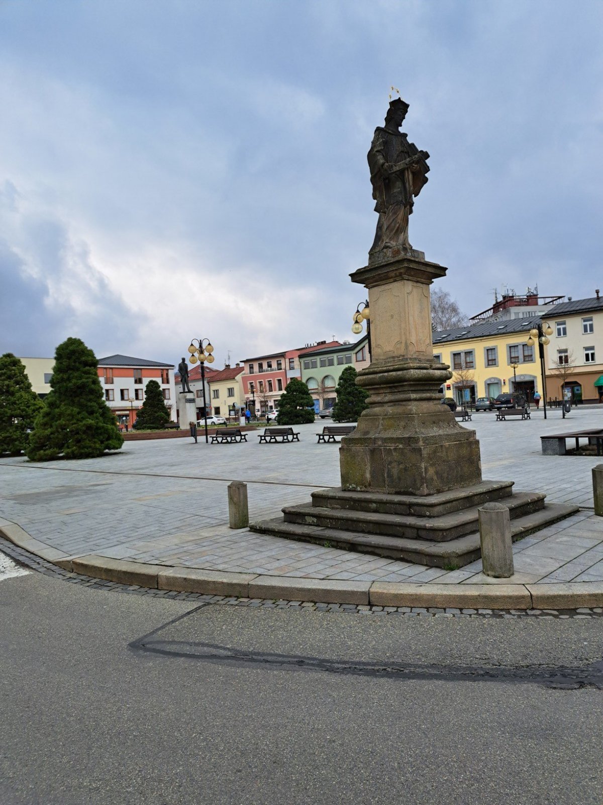 Sochu zmíněného světce jsem tentokrát objevil na Masarykově náměstí v Rožnově pod Radhoštěm. Na obdélníkovém náměstí, které je přirozeným centrem města, se vedle Jana z Pomuku nachází ještě sochy Tomáše Garriguea Masaryka a svatého Floriána. Sochu sv. Jana Nepomuckého nechal vyrobit roku 1722 měšťan Václav Kvinta na svůj vlastní náklad. Většina soch zobrazují svatého Jana Nepomuckého obdobně. Také v tomto případě se snažím rozeznat jednotlivé části kanovnického roucha – kapuce, almuce, rocheta a klerika. Kněz má biret na hlavě a v náručí drží krucifix, nejvýraznější symbol křesťanství. To, podle čeho lze sochu Jana Nepomuckého rozpoznat na první pohled, je pět hvězd okolo jeho hlavy. Mají připomínat legendu, podle níž našli rybáři ve Vltavě jeho mrtvé tělo. Hvězdy symbolizují i pět ran Kristových či pět písmen slova TACUI (mlčel jsem), které společně s prstem před ústy připomíná zachování zpovědního tajemství. Vedle Panny Marie je sv. Jan Nepomucký jediným světcem, u kterého je svatost označena hvězdami.