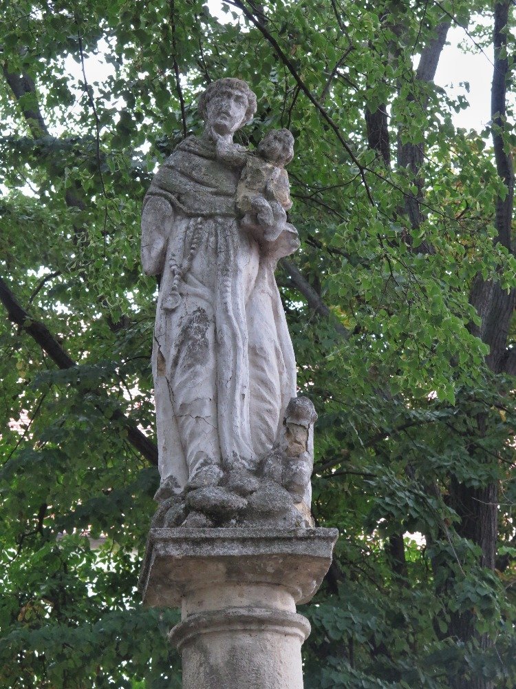 Tato barokní památka pochází z roku 1719 a sv. Antonín je zde tradičně zobrazen s malým Ježíškem v náručí (podle některých informačních pramenů se sice jedná o andílka, ale tato interpretace je chybná) a s beránkem u nohou. Socha světce oblečeného do mnišského roucha stojí na desce, která zakončuje vysoký hladký sloup umístěný na hranolovém podstavci s německým nápisem.