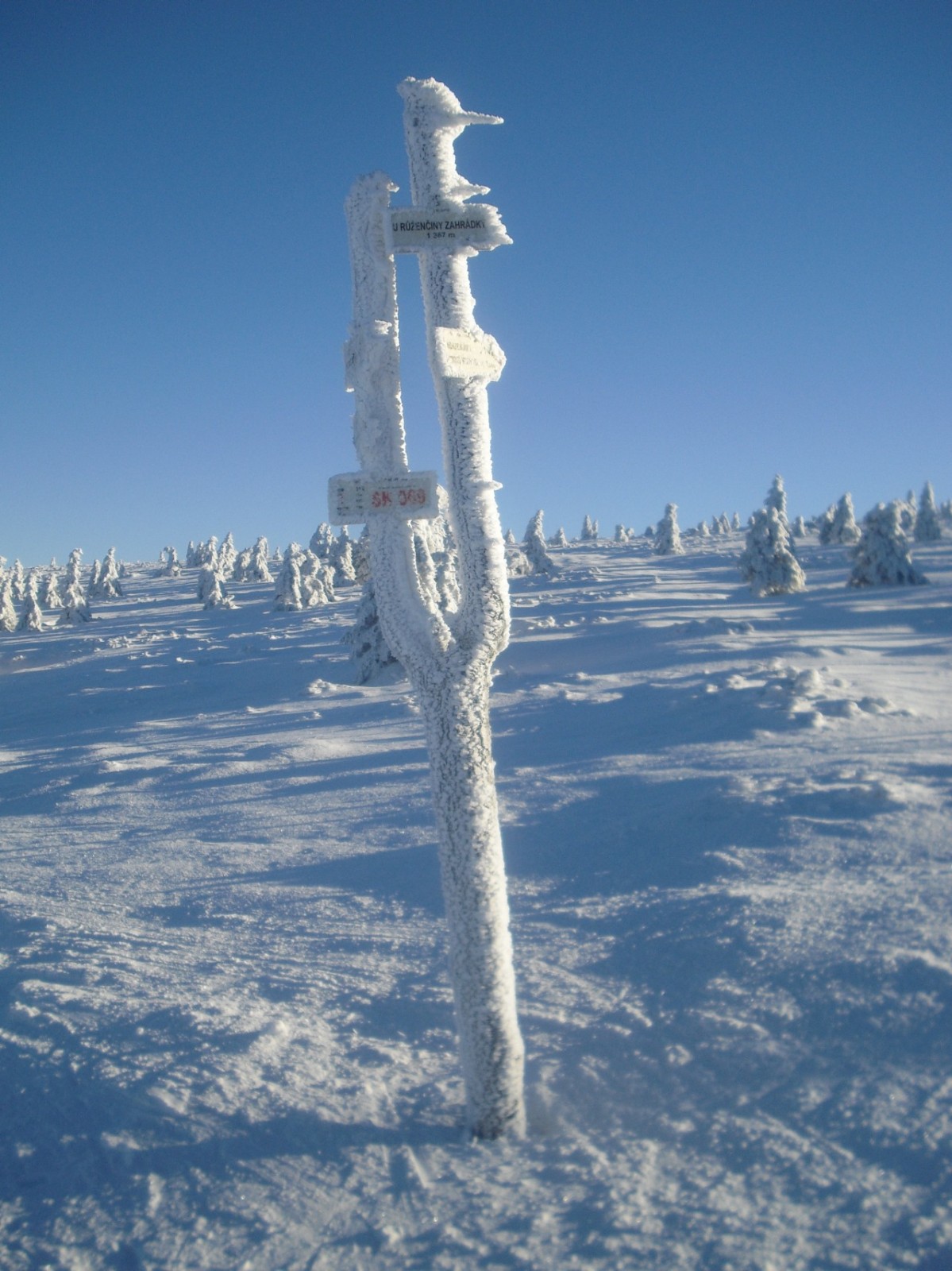 Již podruhé v krátkém časovém sledu píši neobvykle o rozcestí či ukazateli turistických cest. Stejně jako v případě Ručiček, také v tomto případě se jedná o velice zajímavé místo. Je pravda, že hlavně v zimě ho může někdo snadno přejet nebo přejít bez povšimnutí. Asi 300 metrů odsud je rozcestí jménem U Růženčiny zahrádky, odkud je to po zelené nejblíže k pramenu Labe.