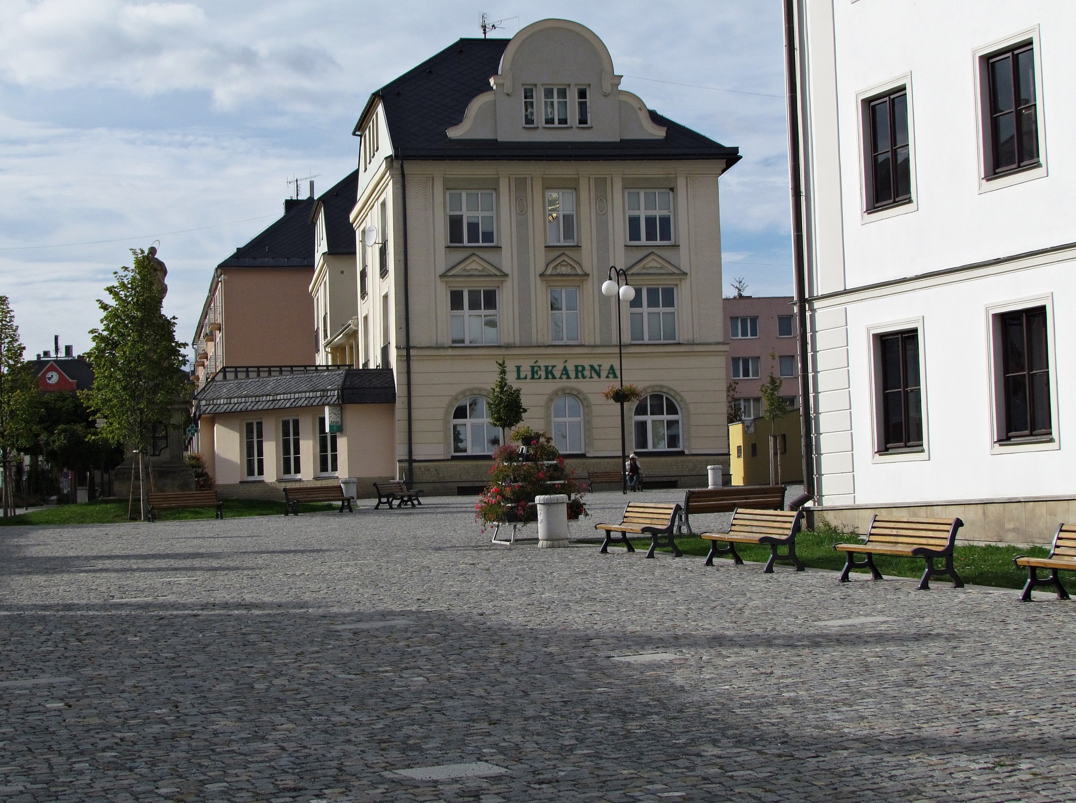 Vzorně opravená klasicistní budova lékárny stojí na severozápadní straně rýmařovského náměstí Míru a spolu s Radnicí a sousedním barokním morovým sloupem patří k jeho největším ozdobám. Současně je z celé fronty domů na této straně jediným původním stavením. (Kvůli bourání zde od 40.let minulého století vznikla proluka, která za nepříznivého počasí umožňuje silným větrům znepříjemňovat procházku po hlavním městském rynku.) Prodejna farmaceutik je v budově záležitostí novodobou. Původně byl totiž její přízemní interiér (zbytek plnil obytnou funkci) vyhledáván z naprosto jiného důvodu - kvůli příjemnému strávení volného času a utrácení peněz, těžce "vydřených" z prodeje produktů místního textilního průmyslu. Ale jestli si myslíte, že zde bývala jen tak obyčejná hospoda, tak to jste na omylu - páni podnikatelé přece ani tehdy nechodívali posedět do nějakého pajzlu, ale k těmto účelům jim sloužily nóbl kavárny. Jenže s úpadajícími textilkami přišel i krach té luxusní rýmařovské a poté její interiéry zaplnily produkty firmy Baťa. Ty neprodané mohly ještě pozorovat nucený odchod německých obyvatel, ale pak už to šlo s krásnou budovou z kopce a kvůli dezolátnímu stavu muselo být dokonce zbouráno celé levé křídlo! V devadesátých letech minulého století se ale stal takový menší zázrak: budova byl jednou z prvních, které se ve městě dočkaly rekonstrukce. A při ní bylo velmi citlivě dostavěn i ten neexistující zbouraný trakt a střecha pokryta břidlicovou krytinou, která je pro celé Rýmařovsko tak typická...