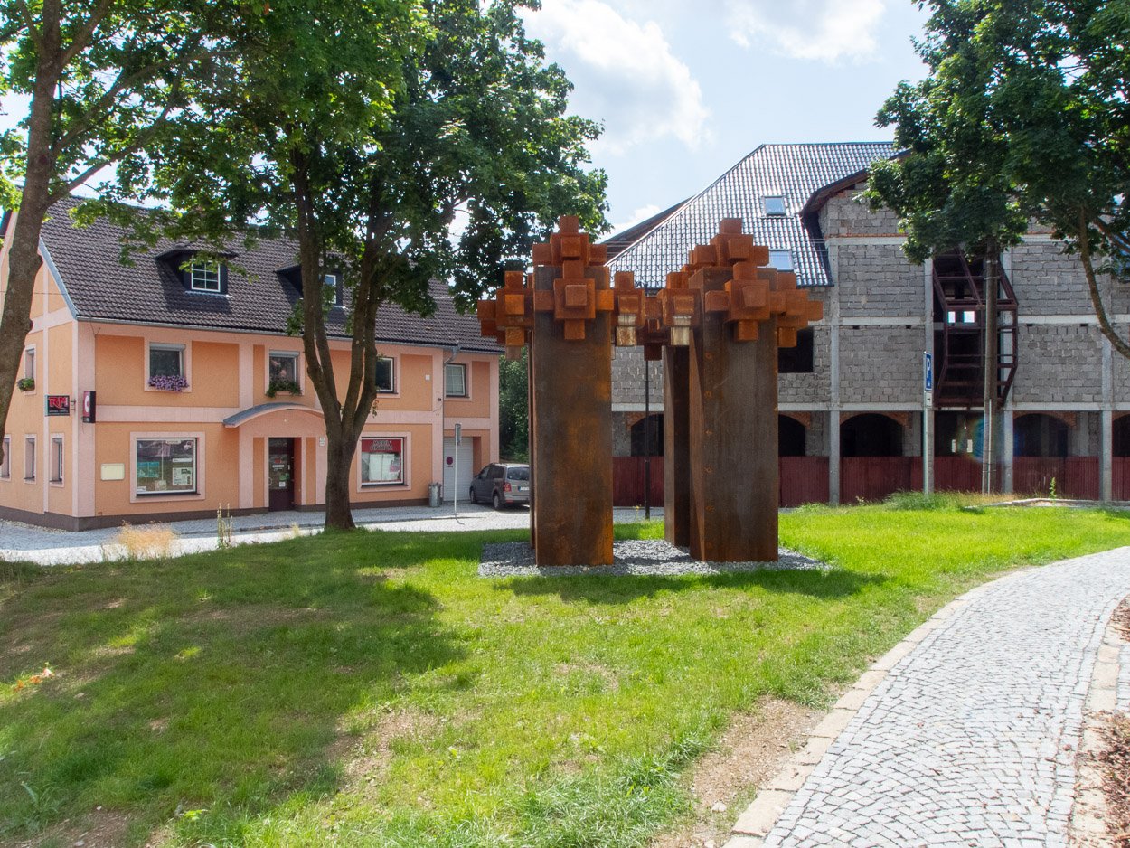 Název Fraktály použil i olomoucký výtvarník, sochař, keramik Lubomír Dostál při instalaci nového artefaktu, který najdeme v Rýmařově při sestupu z náměstí směrem k parčíku u autobusového nádraží. Jde o sestavu čtyř mohutných ocelových hranolů ve vrchní části doplněný sestavou různě seskupených krychlí ze stejného materiálu. Přesnější označení materiálu je corten, což je speciálně upravená ocel, která dostane po čase na povrchu vrstvičku koroze, dál už ale nerezaví. No a právě v těch krychlích můžeme objevit jakýsi opakující se řád, tedy ten fraktál. Dílo takřka ještě čiší novotou, instalace proběhla v polovině roku 2023, foceno v červenci, a to ještě před samotným slavnostním odhalením. To vlastně proběhlo 5. srpna, asi u toho dost pršelo, ale to vlastně nevadí, když má být ten corten povětrnostem odolný. Upraveno je i místo kolem skulptury, dá se posedět, přibyly záhony s květinami, dá se i vstoupit do objektu, který může tak trošku připomínat i kapli. Fraktály nejsou jediným dílem L. Dostála, které ve stejné době vzniklo, takže ještě přijde jeden díl.