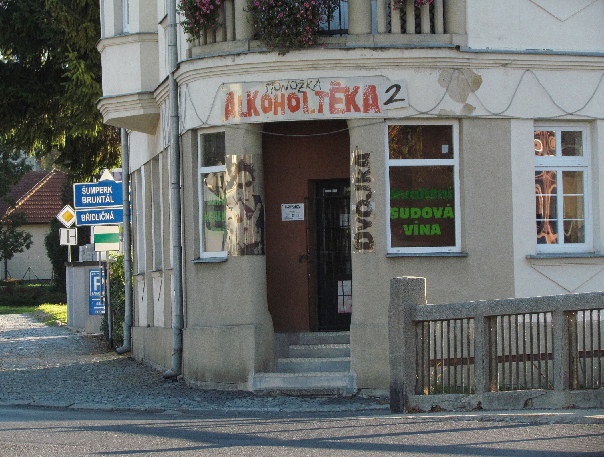 Pocházím z kraje, kde jsou populárnější spíš palírny ohnivé slivovice, ale ani my Valaši nejsme barbaři a občas navštívíme nejen hospodu, ale i nějakou tu vinotéku. Ale na mou duši - s obchodem, nesoucí nápis Alkoholtéka - jsem se setkal opravdu poprvé v životě. Stalo se tak při našich procházkách Rýmařovem a narazili jsme na něj na Revoluční ulici. Nadpis obchodu mne napřed skoro rozesmál... ale nakonec - proč ne, když nabízí nejen dárky, slané pečivo a jiné podružné produkty (jako třeba tekutiny s absolutním nedostatkem alkoholu), ale hlavně ušlechtilé pití, v němž je tento démon přítomen! A to nejen destiláty, ale i vínečko flaškové a sudové.