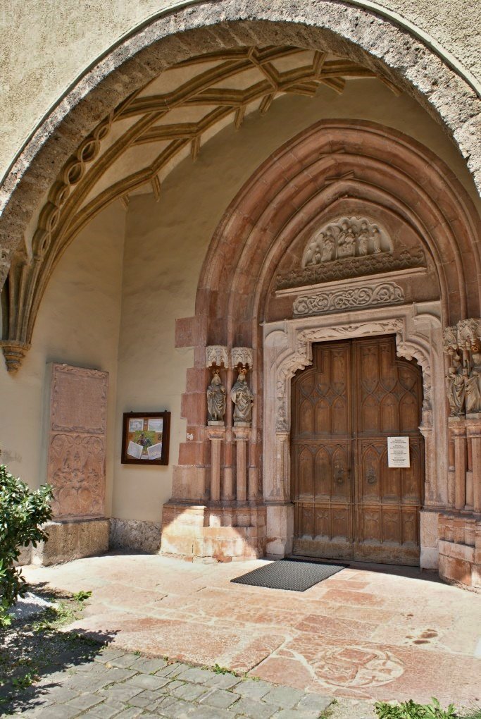 Oba boční oltáře sice pocházejí až z konce 19. století, ale např. Pieta z levého oltáře vznikla v letech 1415 až 1420 a některé reliéfy pravého oltáře v roce 1522, a to ve stejné dílně, jako oltář hlavní. Vidět zde můžeme Mystické sňatek sv. Kateřiny, Krista na Olivetské hoře nebo Ukřižování. Součástí tohoto oltáře je rovněž busta sv. Uršuly a postavy dvou biskupů. Další oltáře se pak nacházejí v trojici bočních kaplí. Oltář východní kaple vznikl v roce 1734, jeho autorem je J.B. Tschiderer a oltářní obraz namaloval v roce 1741 Peter Pewanger. Mramorový oltář ve střední kapli vznikl roku 1746 a oltářní plátno bývá přisuzováno Arseniovi Mascagniovi. V západní kapli se pak nachází kamenný oltář Josefa Dopplera z roku 1746. Součástí tohoto oltáře jsou mj. sochy Lorenze Harmblera.