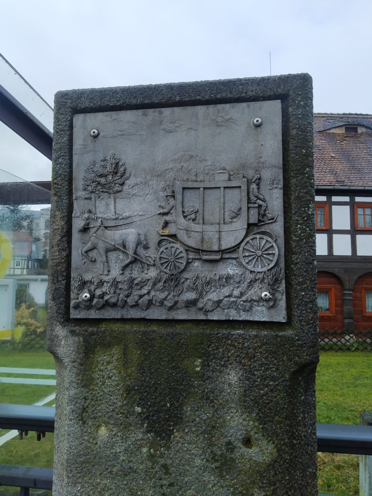 Poblíž stojí žulová stéla s reliéfem poštovního jezdce a s reliéfem poštovního dostavníku.