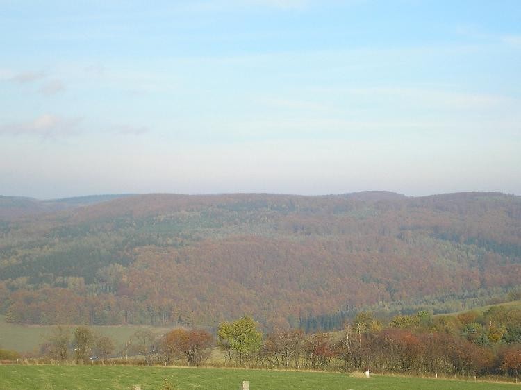 Výhled na podzim: Neuhausen vpředu, na horizontu vpravo přehrada Rauschenbach na Flájském potoce a nad ní Cämmerswalde
