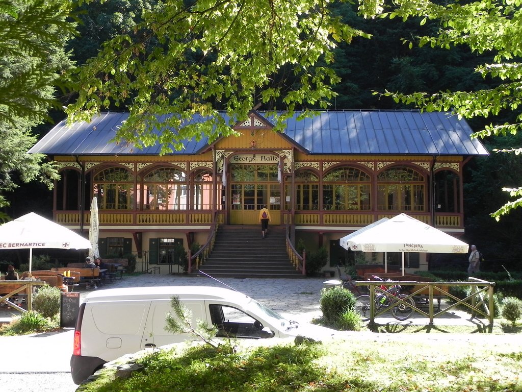 Naše toulání Jesenickem mělo i několik cílů, které jsme nechtěli minout. Jedním z nich byla i secesní Tančírna v Račím údolí na okraji Rychlebských hor. Bylo nutné najít odbočku z hlavní silnice ještě před Javorníkem. To se povedlo a po úzké silničce jsme po několika minutách stáli na malém parkovišti. Uvítala nás tabule s nápisem „Konec světa“ a další s prosbou lesa a oznámením, že je k Tančírně jen 200 metrů. Po levé straně míjíme několik domů a na straně opačné je park. O něco dále se mezi stromy objevuje Tančírna. Ještě před ní stojí zajímavá socha z kovových knih a tabule s vysvětlením o co vlastně jde. Do otevření Tančírny zbývá trochu času a tak využíváme posezení a vracíme se do minulosti. Tančírnu nechal postavit mezi roky 1906 – 1907 německý kardinál římskokatolické církve Georg von Kopp. V této době měla název Georgshalle po svém zakladateli. V přízemí byla restaurace a penzion a nahoře taneční sál. Použitý materiál bylo dřevo a sklo. Píše se, že Tančírna byla velmi vyhledávaným a oblíbeným místem. Po druhé světové válce byl objekt majetkem církve. Od roku 1954 je vlastníkem stát a v držení se střídá několik podniků. Tím posledním jsou České dráhy, od kterých Tančírnu kupuje v roce 2007 obec Bernartice. Zdevastovaný objekt čekají nezbytné opravy mezi roky 2012 a 2013 a následuje obnova, která končí v roce 2015 a objekt se otevírá veřejnosti. Minulost jsme probrali a Tančírna už také otevírá. Procházíme sálem a je to prostě nádhera. Asi to lépe dopoví fotografie. Jinak, vstupné je dobrovolné a pokud se do těchto končin zavítá, Tančírna by se měla navštívit.