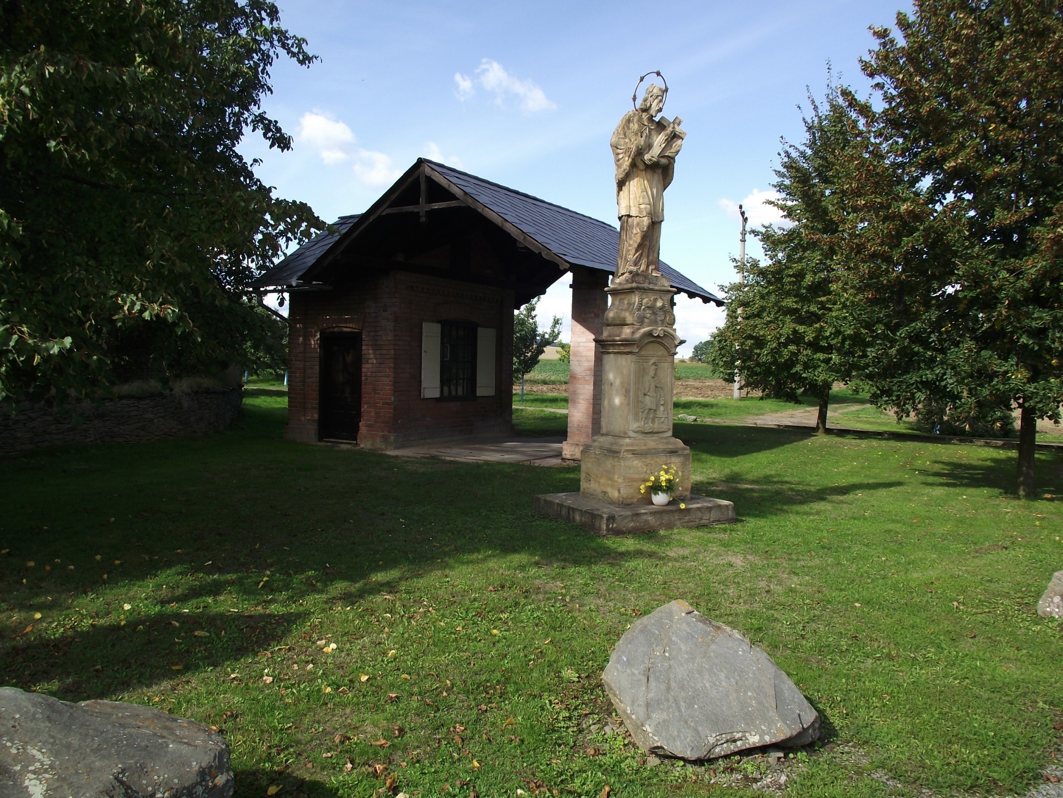 Vpravo od sochy nejznámějšího českého světce se nachází výklenková kaplička z 19. století, v jejíž nice se skrývá – téměř bezramenný – smírčí kříž, starý přibližně 400 až 500 let. Jedná se tedy o nejstarší památku v obci. Na kříži jsou – dnes již těžce rozeznatelné - rytiny hole a měče. Za kapličkou najdeme i torzo kmene 200 let staré lípy, která byla vyvrácena při větrné smršti v roce 2002.