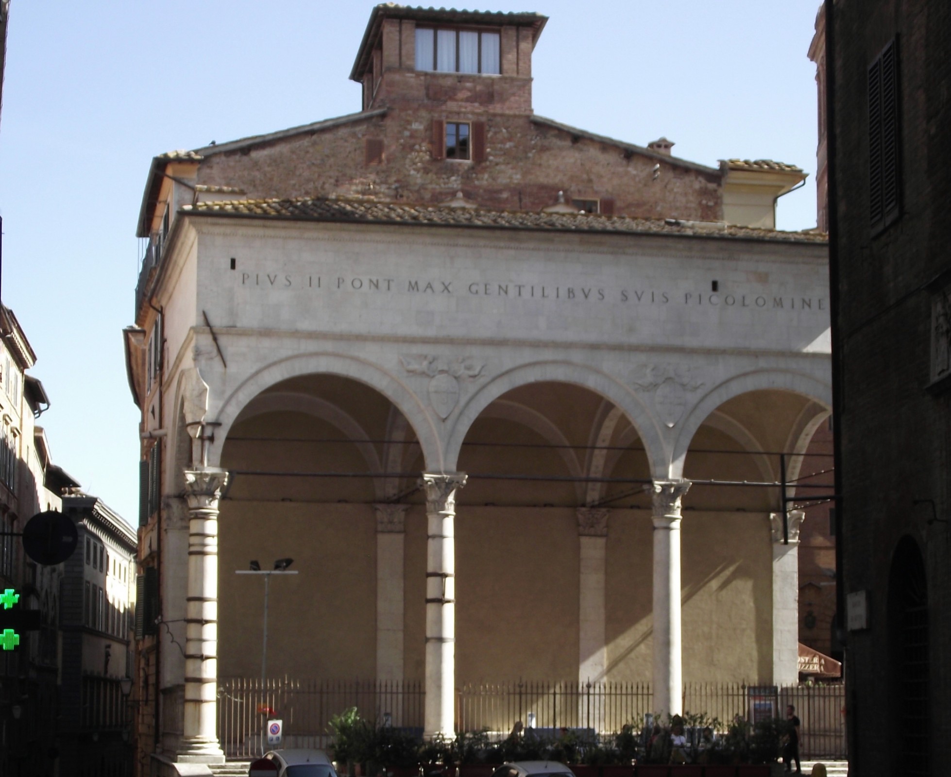 Jednou z mnoha sienských památek je tzv. Papežská lodžie, nacházející se v těsném sousedství kostela sv. Martina (Chiesa di San Martino). Stavbu zdobí heraldické štíty, včetně papežského erbu Pia II. z rodu Piccolomini s pěticí srpků měsíce na kříži a diadémem. Lodžie je klasickou otevřemou arkádovou renesanční stavbou, postavenou v roce 1462. Autorem stavby se stal – z pověření zmíněného Pia II., který ji věnoval své rodině, vlastnící nedaleký palác – sienský stavitel Antonio Federighi.