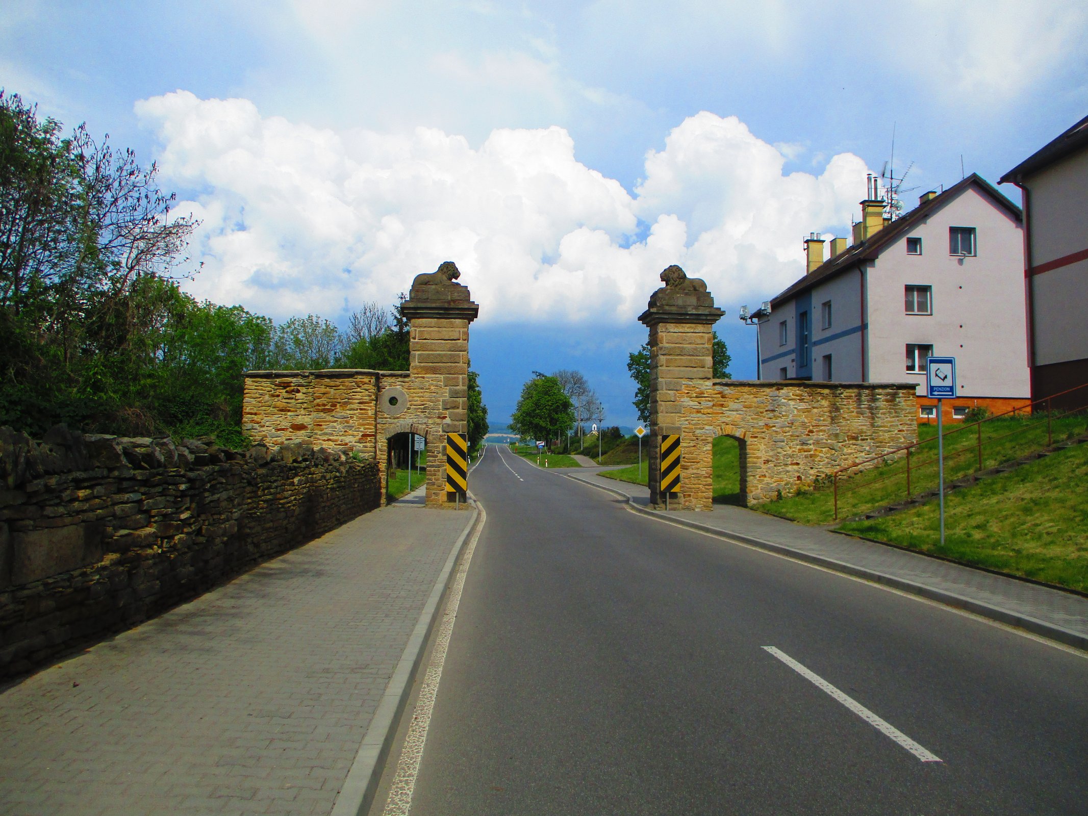 Původní klenutí bylo shozeno a nová brána byla upravena bez něj. Ve veřejné dražbě získal provedení těchto prací Josef Pozdílek z čp. 27, ale dohodnutý termín nedokázal dodržet, takže c. k. okresní hejtmanství pohrozilo, že brána bude odstraněna exekuční cestou, pokud nebudou všechny práce dokončeny do 8 týdnů. Během této lhůty bylo zbouráno klenutí a vystavěna pískovcová brána se dvojicí pilířů, jejichž vrchol byl opatřen římsou a ležícím lvem z téhož materiálu od sochaře Antonína Suchardy. 3. prosince 1885 byla brána převzata obcí a Josefu Pozdílkovi bylo povoleno vyplatit z obecní pokladny 463 zlatých a 26 krejcarů, i když ne najednou, nýbrž během následujícího tříletého období. Brána se stala nejen okrasou obce, nýbrž místem, které bývalo pravidelně ozdobeno jako slavnostní, když obec navštívil nebo jí projížděl někdo významný. V letech 1938-1939 došlo k nové výdlažbě silnice, což znamenalo jak úpravu chodníků a plotů, tak brány samotné.