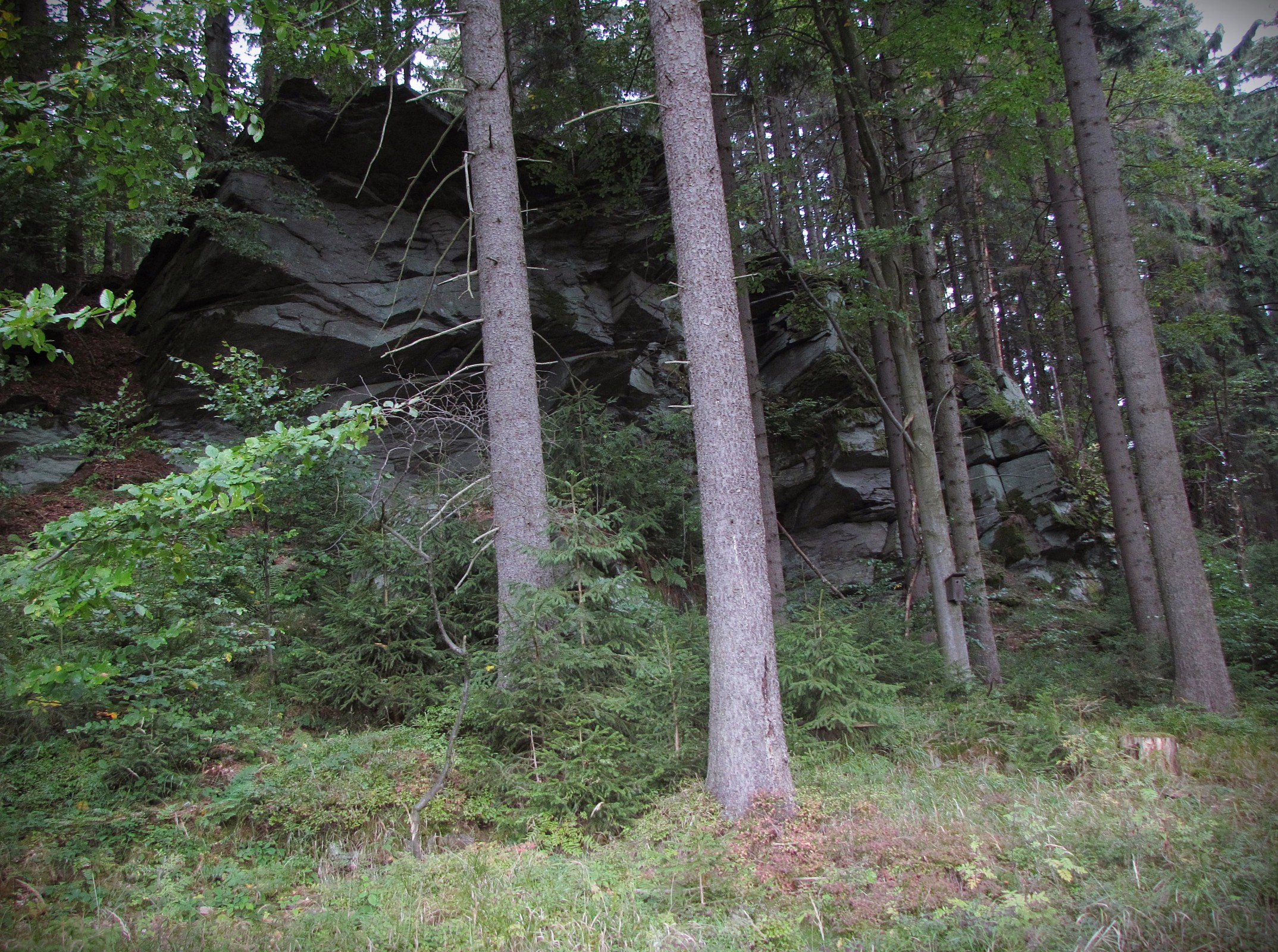 Nás laiky ale bude zajímat především to, že je tohle skalisko při naší pouti velmi zajímavým oživením a že mu porost horského lesa, který jej rámuje, dodává i výrazný estetický půvab. Když už jsme u té estetiky - ten malý skalní hříb, nacházející se mezi mrazovým srubem a lesní cestou... tak ten je naprosto rozkošný! A za shlédnutí stojí i dva pitoreskní skalní výchozy, trčící z lesního svahu za samotným koncem dlouhé skalní stěny...