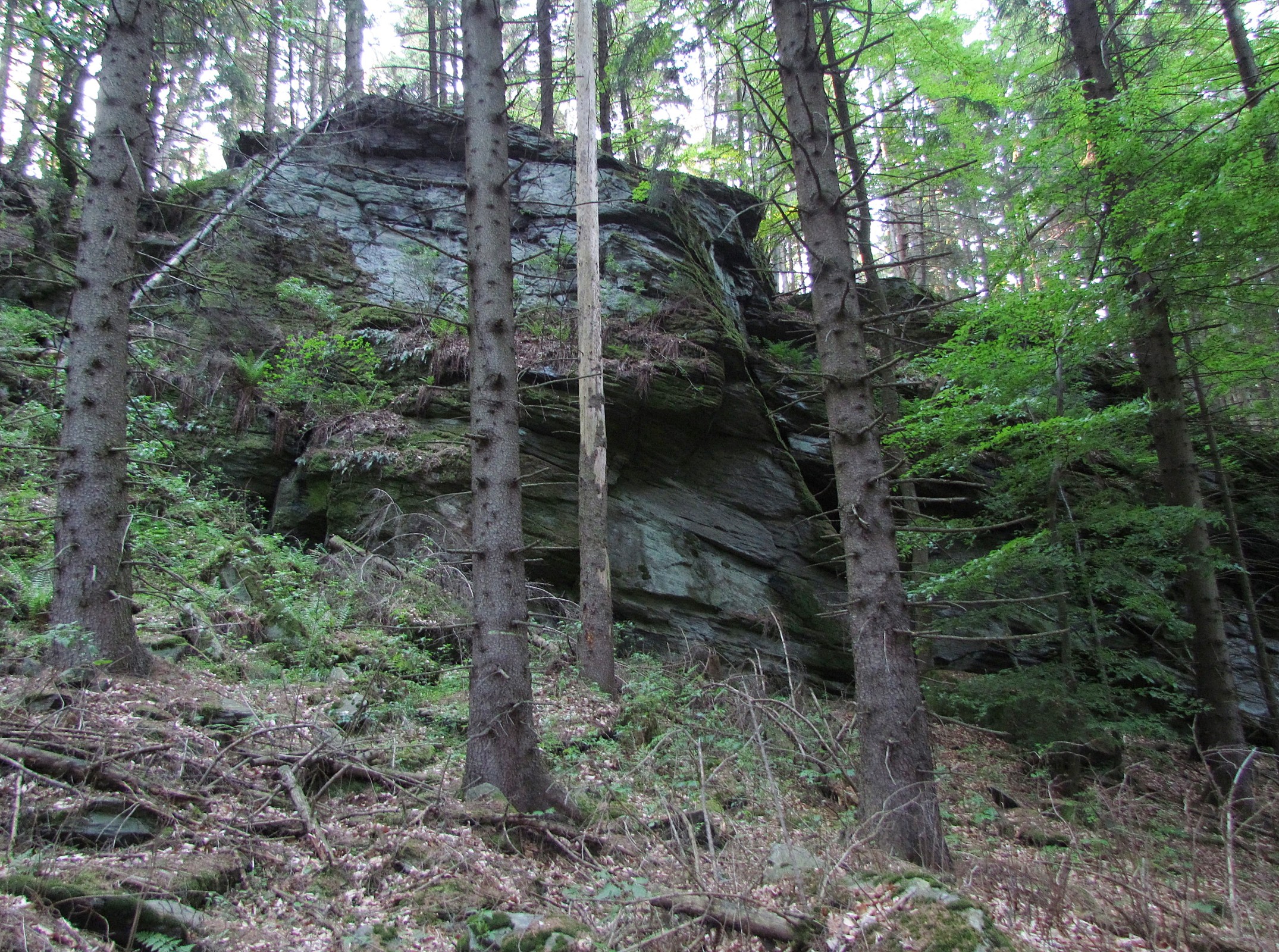 Ještě před tím, než se ale vydáte na zpáteční cestu, chtěl bych vás upozornit na zajímavou skálu. Nachází se vedle lesního průseku směrem k Plošině a je vzdálena jen asi 100 m od rozcestí. Při pohledu shora nás přivítají zajímavé, ale nevysoké skalky, které si označení velké ikonky skály v mapách podle vás asi rozhodně nezaslouží. Všechno je ale jinak, pokud se rozhodnete obejít skalní výchozy k jejich úpatí. Namísto drobných skalek vás zde čeká pohled na mohutnější stěnu mrazového srubu o délce asi 50 m a největší výšce až deset metrů. Skála patří do „desenské rodiny“ a na geologických mapách je označena jako blastomylonit. Což je vědecké označení pro krystalické břidlice, přeměné velkými tlaky napřed na ruly, fylity apod... a poté prošlé ještě dalšími „tlakovými úpravami.“