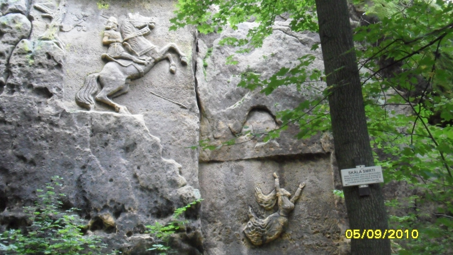 Po zelené značce z nemalé obce Kunratice u Cvikova se podél toku říčky Svitavky dostaneme k místu kapku zakletému a tajemnému se smutnou pověstí.I když okolní skály a tok říčky působí velice romantiky,název místa je zastrašujicí.NA skále nad řekou zv.Skála smrti,je vytesán unikátní reliéf rytíře na koni a dívky padající ze skály a to podle zdejší pověsti.A ta praví že "pronásledovaná dívka ze zoufalství skáče z vysoké skály,ale zachrání se.Zlí rytíř na okraji skály uklouzne a padá s koněm do bažin, kde se utopí".