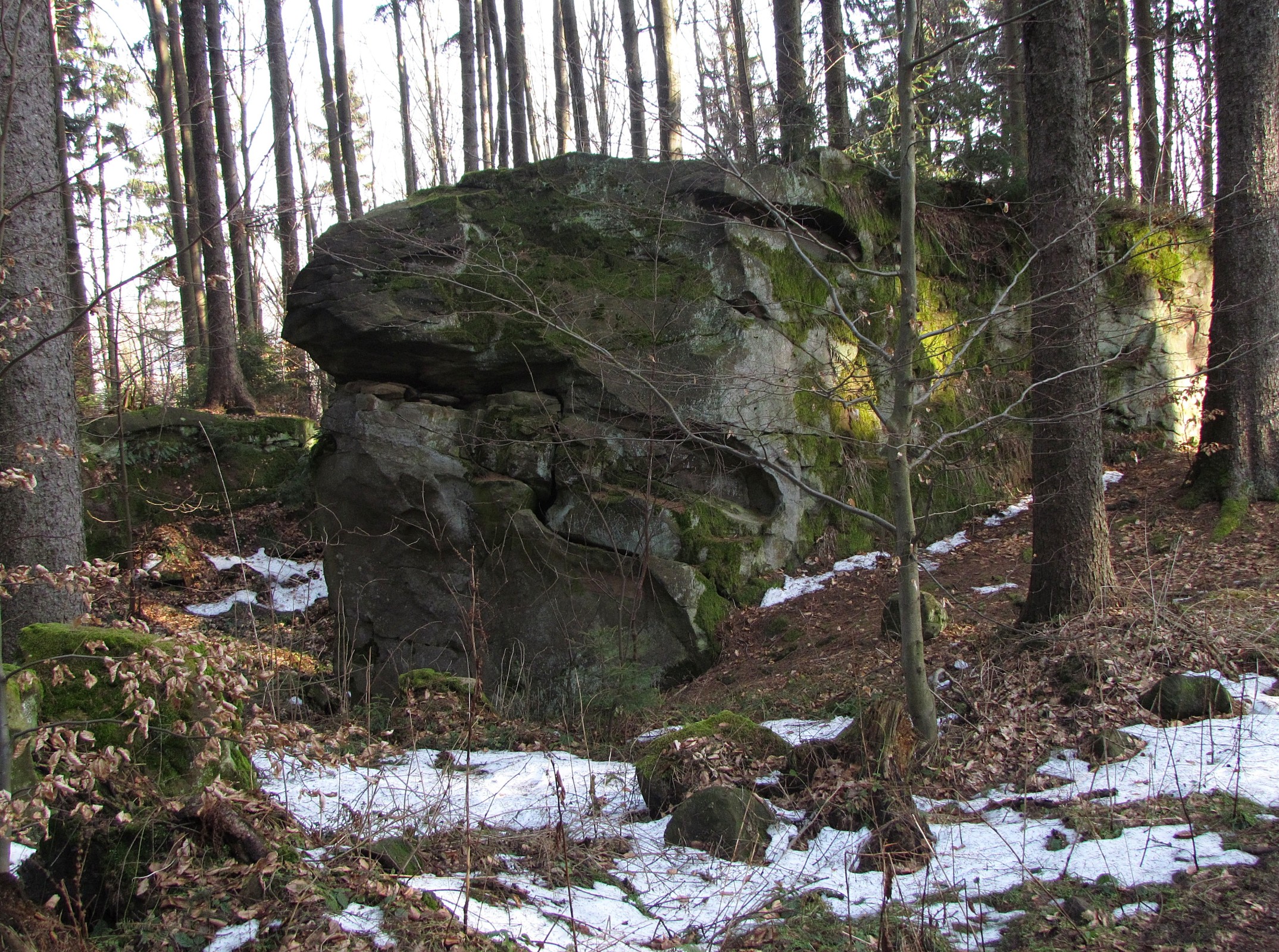 Přibližně 150 metrů pod vrcholem zalesněného vrcholu Kopců (699 m) a vysoko nad známými Čertovými skálami u Lidečka se nachází přírodní rezervace Kopce. Ta slouží ochraně mimořádně rozlehlého skalního sesuvu v pískovcích a dalších jevů. Zvláštností je množství hlubokých a dlouhých příkopů po obvodu sesuvu. Ačkoliv vypadají jako dílo lidských rukou, mají příkopy ryze přírodní původ. Při hlubinném ploužení tu ve strmých svazích hory vznikly příkopy a deprese (až 6 m široké), na něž se těsně pod zemským povrchem váže soustava suťových a rozsedlinových jeskyní. Roku 1994 zde speleologové "objevili" soustavu od pradávna známých skalních slují a vchody těch největších opatřili mřížemi, aby zabránili vstupu zvědavcům a aby chránili kolonie zdejších vzácných druhů netopýrů. Nejdelší jeskyně dostala pojmenování Naděje a chodby jejích dvou podzemních pater, spojených 6 m hlubokou propastí, dosahují celkové délky 101.5 metru. Nás ale zajímají skalní útvary, nacházející se v okolí těchto míst. Čela příkopů a strmé svahy nad nimi jsou zdobeny četnými stěnkami mrazových srubů, které ale nedosahují větší výšky než asi 3 - 4 metrů. Největší skalisko ale najdeme o kus níž - hned vedle slepé lesní cesty, která k ní klesá od sedla západně od vrcholu Kopců a od skály pokračuje po vrstevnici dál po obvodu hory. Ze změti příkopů a balvanových sutí ve velké depresi pod touto komunikací se vypíná jedno větší pískovcové skalisko, které dosahuje výše asi šesti metrů.