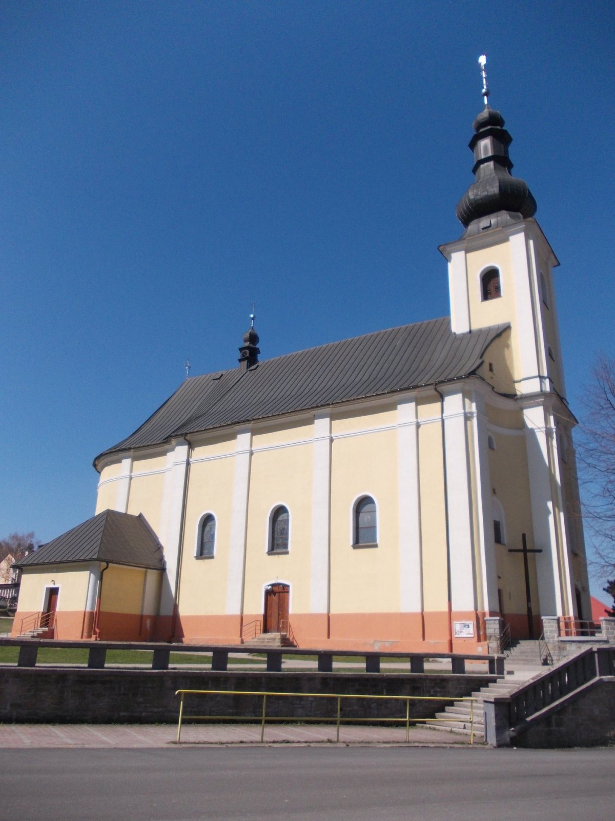 Kostol bol počas veľkonočných sviatkov otvorený, pri fotení jeho interieru sa nám prihodila udalosť, že niekto asi posunul ruku ďalej za zábranu z povrazu pred oltárom, spustilo to alarm a o cvíľu do kolstola dorazila ochranka v športovom oblečení miestného pana farára. Situácia sa objasnila. S príjemným miestnym pánom farárom sme sa pekne porozprávali a poradil nám aj ako miestny znalec kraja, kadiaľ si môžeme skrátiť trasu nášho výletu.