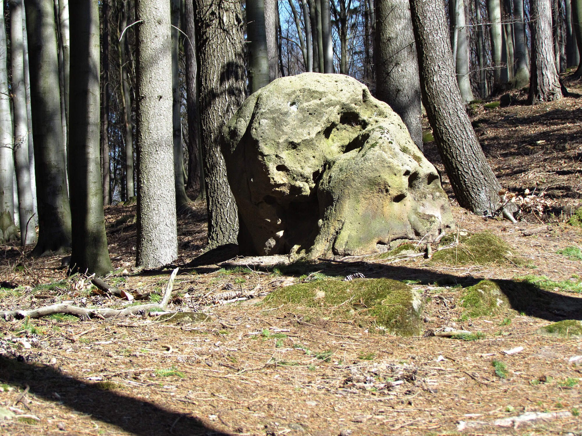 Na dohled miniaturní skalní hradbičky, na níž byl zbudován pomník, se na hřebeni nachází skalnatý suk, z něhož se vypíná skalka, která jako by byla miniaturou blízkého a známého Čertova kamene. Za tímto „Malým Čertovým kamenem“ je odvrácená strana suku ozdobena nejvyšší, přibližně čtyři metry vysokou skálou. Dále již na klesajícím hřebeni člověk míjí další, mnohem nižší, přesto ale velmi půvabné skalky a balvany. Jejich pitoreskní podobu má na svědomí masivní masáž způsobená dlouhodobým selektivním zvětráváním pískovců. K vidění jsou tu drobné formy zajímavých geomorfologických jevů jakými jsou různé drobné i hlubší dutiny kruhového tvaru, římsy, pukliny a škrapy. Ty krášlí nejen temena skalních výchozků, ale mnohde i jejich stěnky. Jen sítě voštin tady nejsou nikde vidět, což možná návštěvníka alespoň trochu geologicky obeznámeného se zdejší krajinou, překvapí.