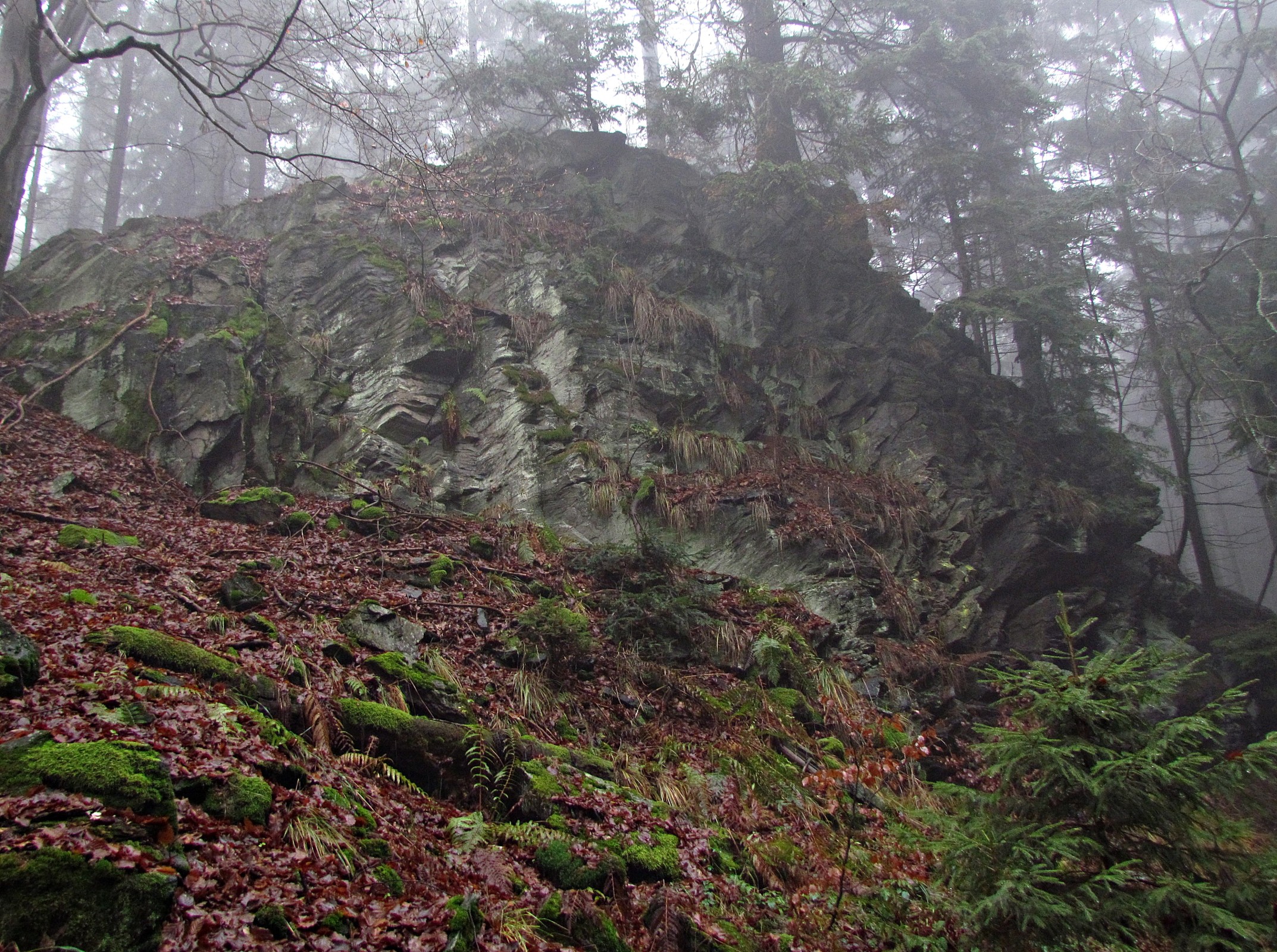 A tak si doteď nejsem jistý, jestli jsem na to hledané souskalí narazil... Ale spíše ne, protože zajímavé protáhlé skalní výchozy, tvořící o kus dál jakýsi malý přírodní amfiteátr, se nacházely už o hodně výš ve svahu Maliníku. Překvapila mne struktura skal, tolik odlišných od malinického „skalního města“, neboť tyhle kameny jakoby byly poskládány z velkých Kamenných šupin. Nejlépe patrné to bylo na nejvyšší, asi 8 m Vysoké rozložité skalce, uzavírající amfiteátr napravo.