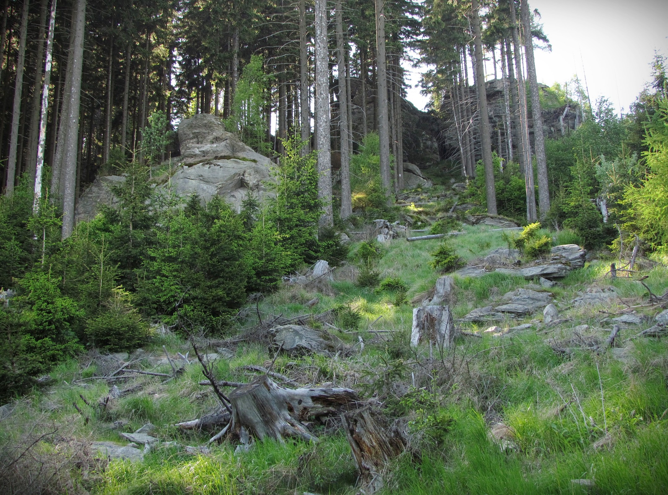 Asi 200 m za studánkou nad silničkou vystupovaly nad lesní porost jakési vysoké, ale nepřístupné skály. Díval jsem se dál vpravo do lesa, jestli by se k nim nedalo nějak rozumně přiblížit, namísto toho jsem ale po dalších 200 m narazil na začátek lesního průseku s výrazným listnatým stromem. O kousek výš se průsek rozšířil do úzké a dlouhé travnaté paseky, velmi zprudka stoupající k hřebeni se zbytkem lesa a nepřehlédnutelnými skalními bloky.
