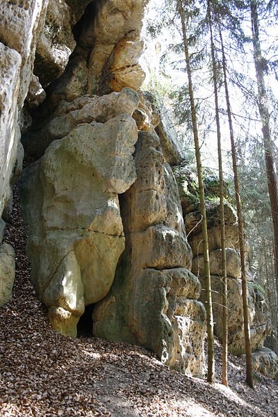 Pískovcové útvary nad kokořínským dolem, západně od obce Vojtěchov. Vznikly selektivním zvětráváním pískovců, za což může vyluhování železa z třetihorních vyvřelin podzemními vodami a vysrážením hydrátu oxidu žele…