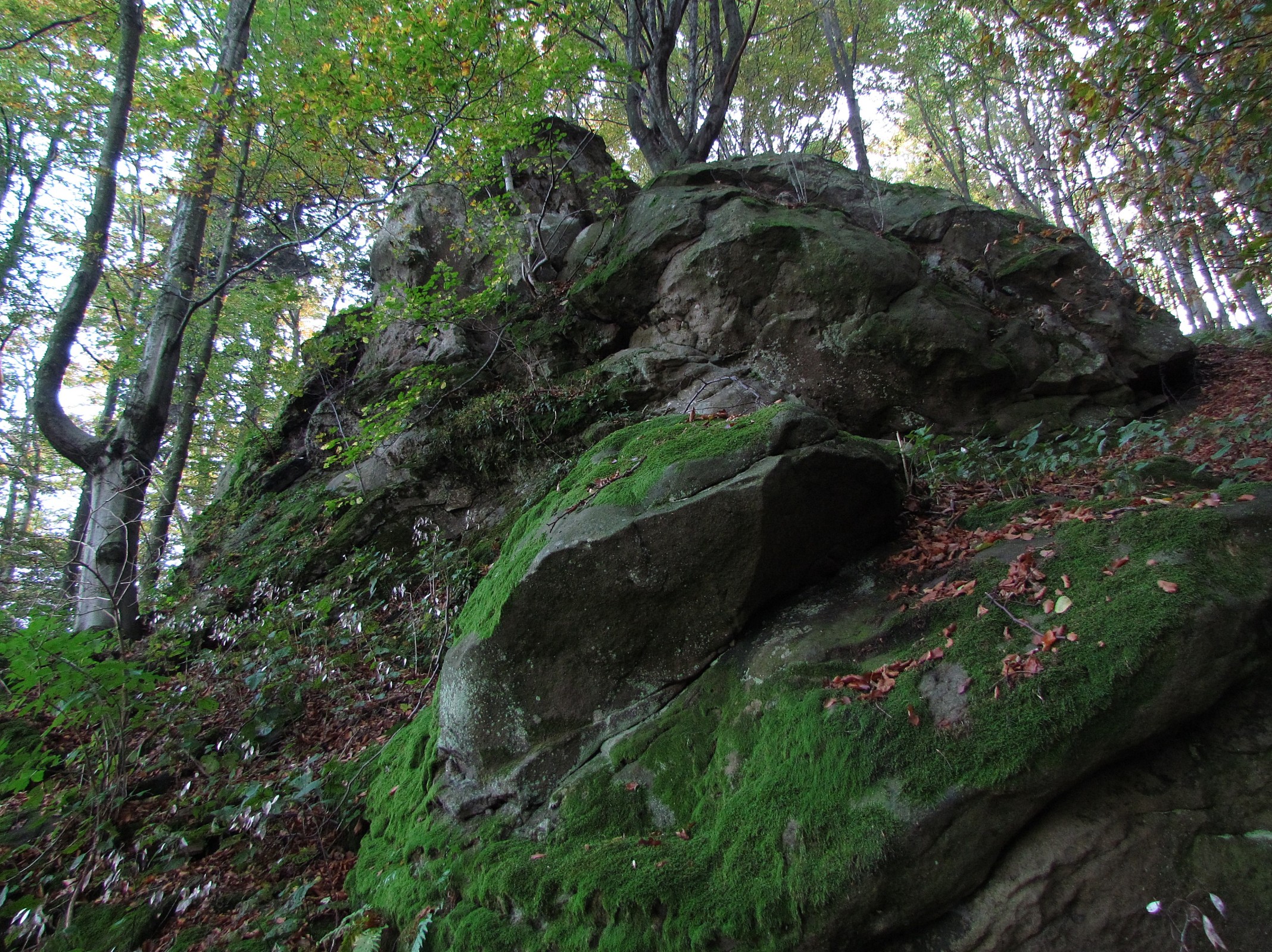 Od zbytků hradní zříceniny na vrcholu Obřan (704 m) v Hostýnských vrších prudce spadá skalnatý pás přerušovaných skalních výchozů také na západní stranu. Skalní stěny pískovců a slepenců, tvořené soláňskými vrstvami magurského flyše, tady nedosahují nijak závratné výše, ale obnažené skalní stěny už nevzhlížejí jen k severu, ale i na západ, čímž pomalu mění svoji podobu mrazových srubů a někdy v daleké budoucnosti se změní na izolovaná skaliska. Samozřejmě za předpokladu, že jsou zbudovány z těch pevnějších lukovských vrstvev a ne z těch ráztockých, které snadněji podlehnou působení živlů. Tento přerušovaný pás skal klesá do údolí v délce minimálně 250 m a níž pod hradní zříceninou jeden skalnatý vrcholek dokonce nabídne moc hezký výhled do údolí Bystřice na rekreační areál Na Valaškách a na protilehlou hradbu kopců, které svou masou zaštiťují nejvyšší "horu" Hostýnských vrchů - Kelčský Javorník. Stěny skal na západ od hradní ruiny nepřesahují výšku 10-12 m (i když jedna vyjímka se tady najde) a ani jejich stěny, tvořené rozhlodanějšími ráztockými vrstvami nenabídnou pohled na nějaký estetičtější geomorfologický projev na jejich povrchu. Tou vyšší výjimkou je veliké rozložité skalisko, nacházející se ale mimo toto "bradlaté" pásmo, probíhající po hřebenu Obřan ve směru západ-východ. Velká skála, jak bychom ji mohli nazývat, leží ve vzdálenosti téměř 300 m jihozápadním směrem od obřanského hradu a tvoří jeden z nižších bočních vrcholů kopce, odděleném od okolí hlubokými suchými žleby. Přístupné temeno skály je tvořeno odolnými pískovci a kdyby nebylo okolního rychle rostoucího stromového porostu, dodnes by se z něj otvíral pohled nahoru na hřeben a na Skalný. Rozložité skalisko prochází destrukcí, některé jeho odolnější části se už pomaličku oddělují a ujíždějí níž po prudkém svahu, lemovaném pod skálou menším kamenným mořem a balvanitou sutí. Jižní strana Velké skály, dosahující výše asi 12-15 m, je tvořena měkšími pískovci a slepenci. A její světlá stěna, obroušená erozí, svítí jako maják do dáli. Od úpatí skály hřeben prudce klesá do hluboce zaříznutého údolíčka s rozcestím lesních cest. Po jedné z nich stoupá červeně značená tur.cesta z Chvalčova do sedla Klapinov a jedině tudy může běžný návštěvník procházet přes PR Obřany.