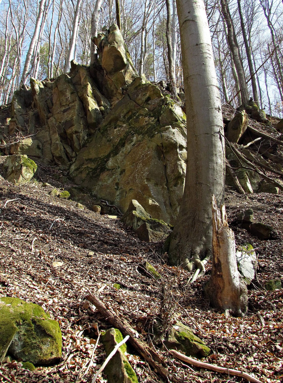 Ve stejné délce ze svahů tří klesajících hřebínků (připomínajích jakési skalnaté splazy) vystupují vlastní útvary, navzájem od sebe oddělené dolíky s balvany a vysoko napadaným starým listím.