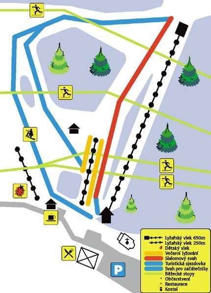 Vzhůru lyžaře vozí vlek dvoukotva o délce 650m, talířový vlek o délce 250 m a dětský vlek dlouhý 80m.