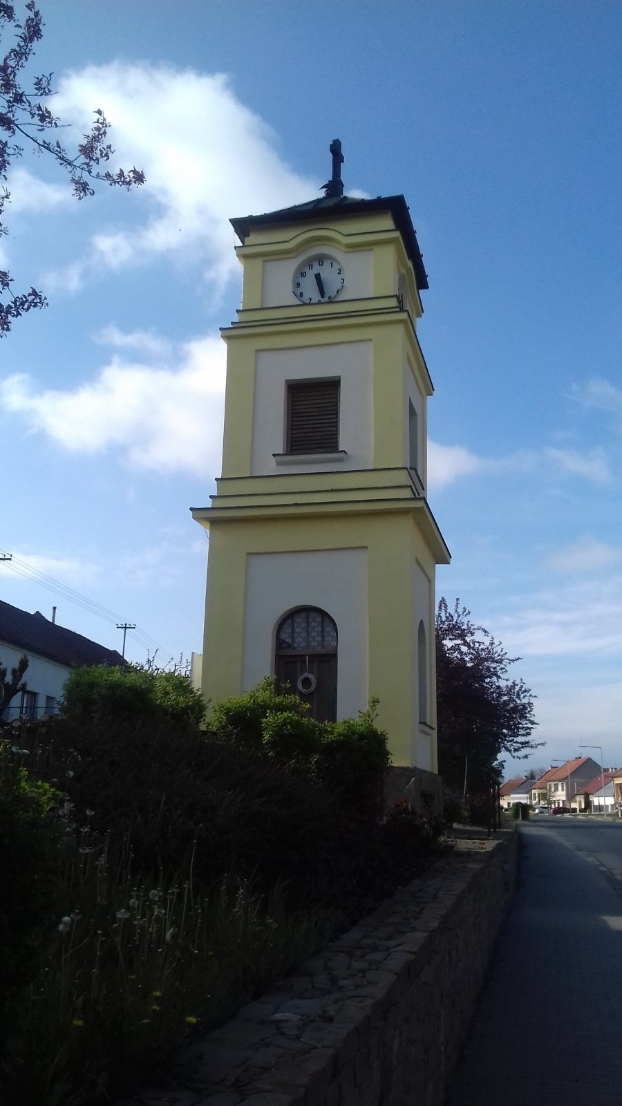 Strieška zvonice má tvar nízkeho ihlanu, je ukončená krížom.