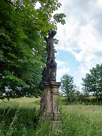 Mezi sochami je další nízký podstavec s rostlinnou ozdobou. Na něj navazuje zužující se dřík, opět rostlinně zdobený, nad menší římsou vrcholový jetelový kříž s korpusem Krista.