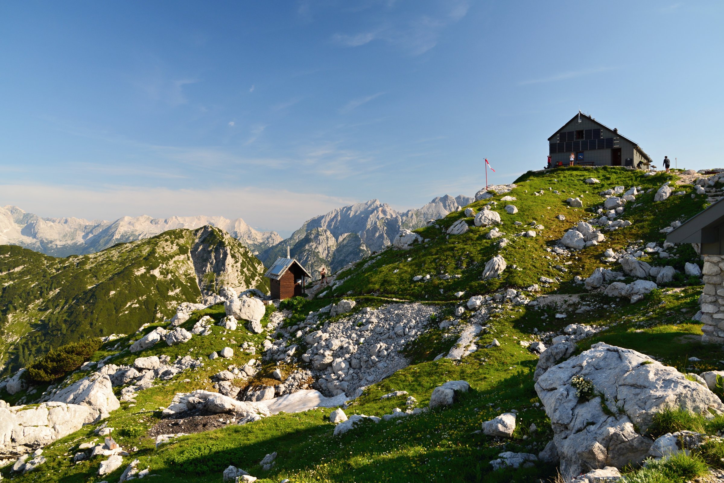 Slovinsko - Julské Alpy: chata Zasavska koča na Prehodavcih, západ slunce