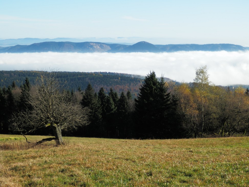 Z mraků vykukují Vraní hory s nejvyšším Královeckým Špičákem, vpravo pod mraky se dá tušit Trutnovsko