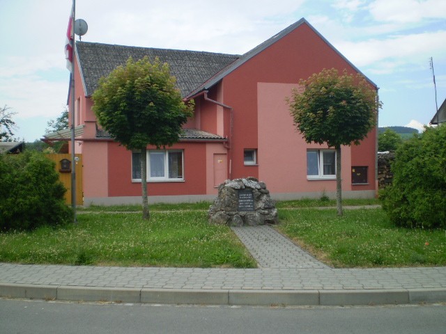 památník z kamenů s oszenou pamětní deskou stojí na návsi v zeleném parčíku.