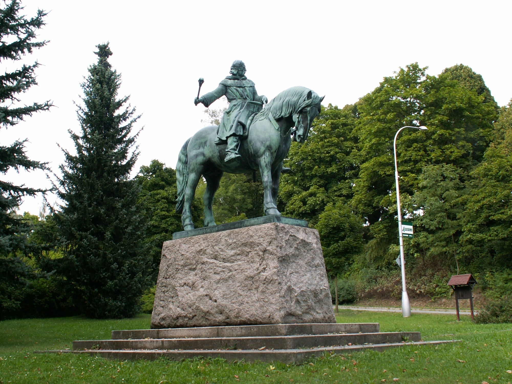 Bronzová jezdecká socha Jana Žižky z Trocnova v nadživotní velikosti. Nedaleko u Žižkova Pole je i mohyla, protože prý zde Jan Žižka zahynul.