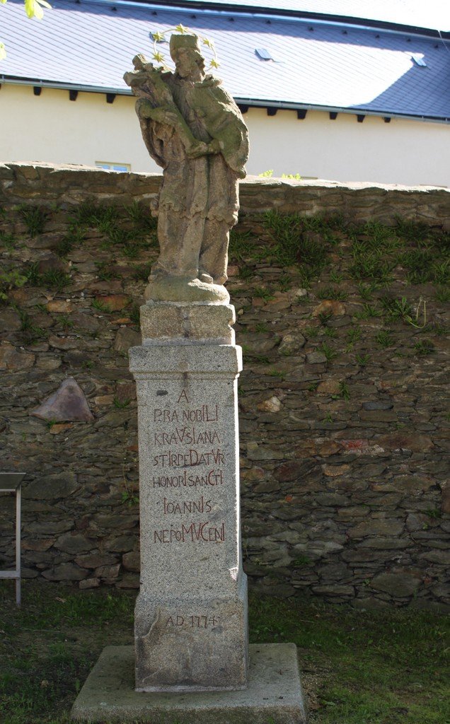 Socha stojí na náměstíčku před zdí, za kterou je nádvoří místní tvrze. Socha byla vytesána z pískovce a je to velmi hezké rokoko. Na hranolovém podstavci pod sochou je latinský nápis a pod ním rok zhotovení sochy 1774. Český překlad nápisu je „ Od urozeného Krausovského rodu darováno k poctě svatého Jana z Nepomuku“. Sv. Jan je vytvořen v tradičním postoji s křížem v pravé ruce. Nad hlavou má svatozář. Socha je od roku 1969 kulturní památkou. Bohužel na ní dosti zapracoval čas a některá místa na soše samé volají po opravě. Kolem zdi roste několik starých stromů. Za sochou ve zdi je vložen kámen dotyků, který symbolizuje současnost. Nechybí tady ani lavička , z níž je hezký výhled na celé náměstí.
