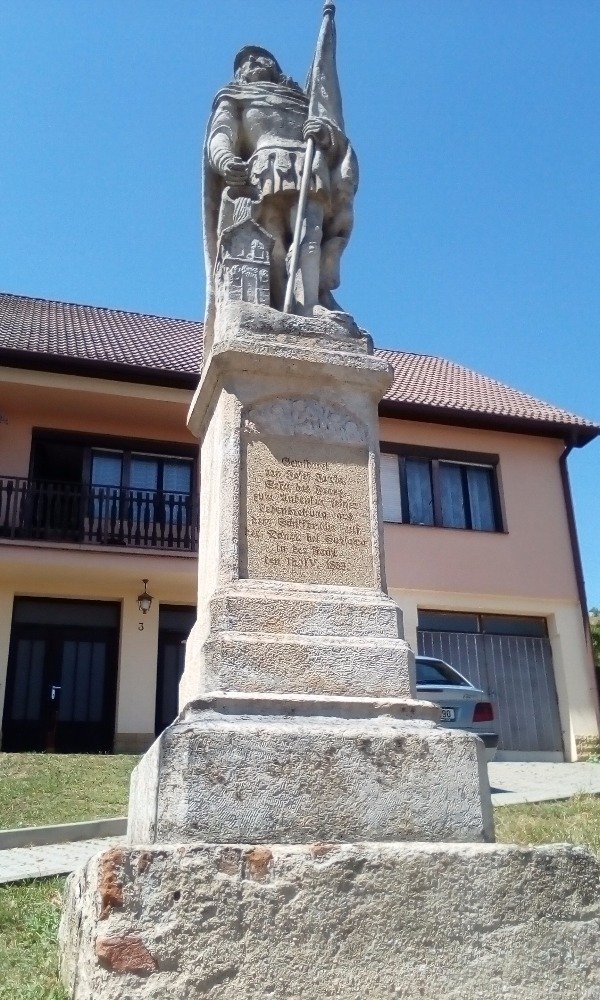 Socha se nachází v centru obce, přímo u hlavní silnice, poblíž kostela a zobrazuje světce v římské zbroji oděný do pláště. V levé ruce má žerď praporu a v pravé puténku.