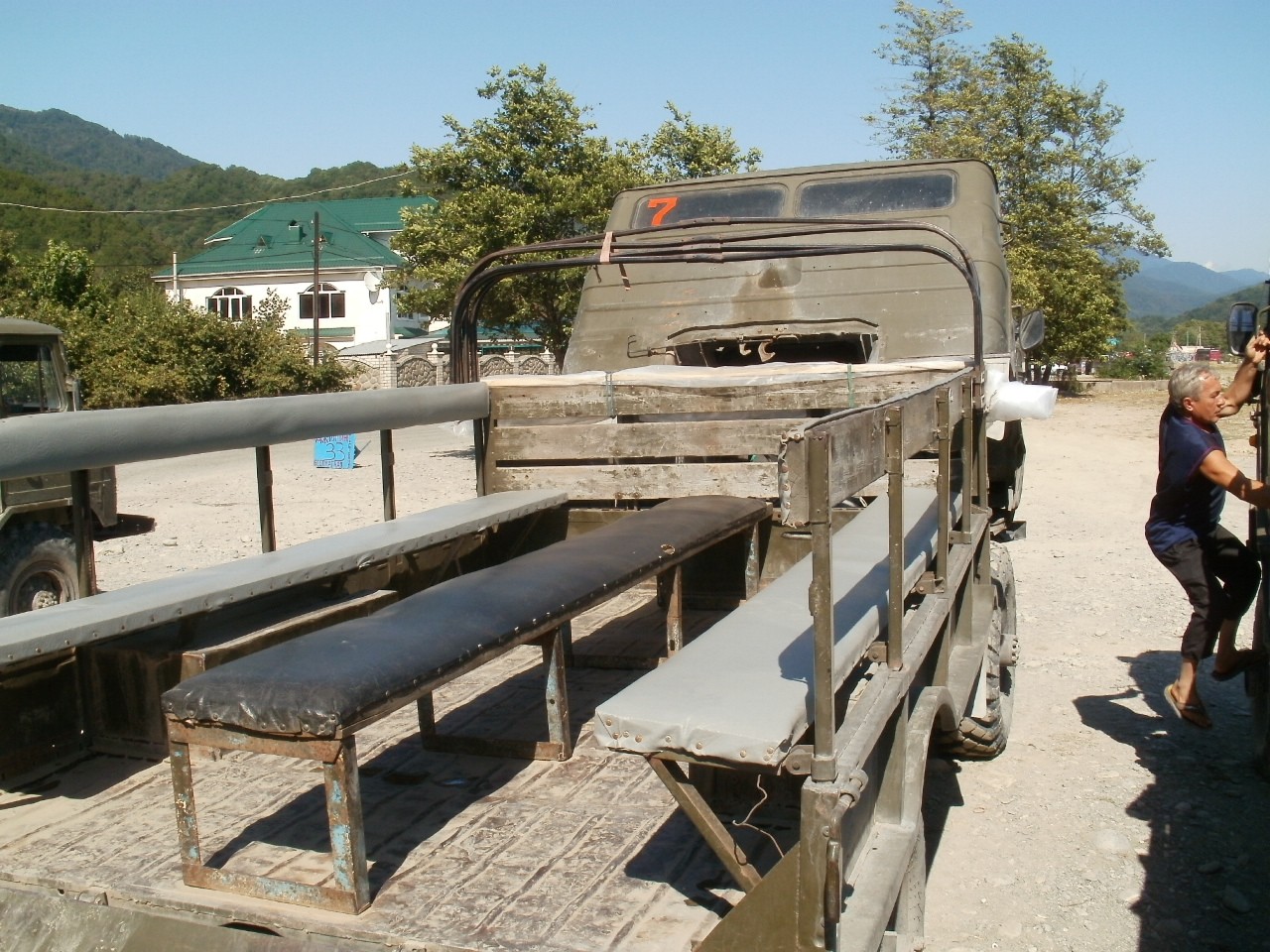 Jeli jsme maršrutkou přes Golovinku (článek) se zastávkou v kavkazském aulu (článek). Od aulu nás vezly speciální terénní "gruzoviki," které jely 20 minut cestou necestou přes malé a velké kameny, korytem řeky, odkud na nás cákala voda za nadšeného pištění turistů. Strašně to házelo, což není pro slabé povahy. Musí se sedět obkročmo jako na kole nebo na koni. Dva odvážlivci fotili okolní zvedající se hřbety Kavkazu.
