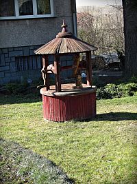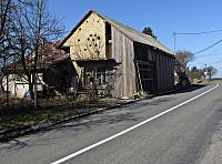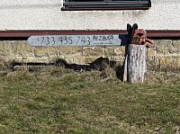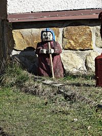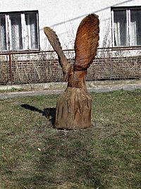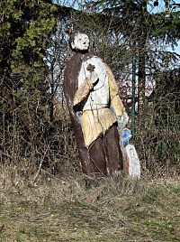 Před koncem obce je před jedním domem vystavena ukázka prací místního dřevořezbáře, doplněná nápaditou reklamou: na špalku je umístěna motorová pila a na listu uvedeno jeho telefonní číslo a emailová adresa.