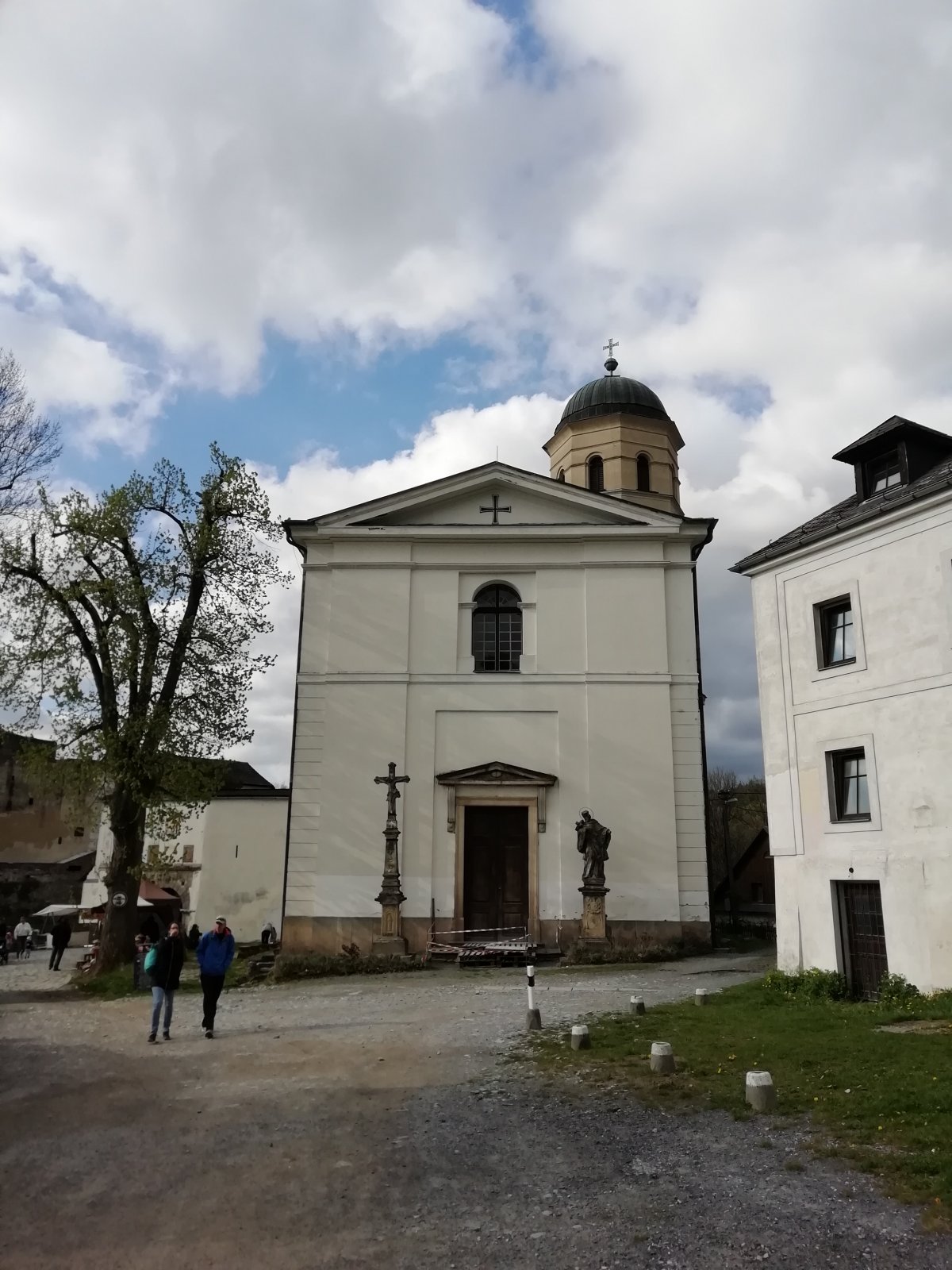 Kostol sa teda nachádza dalo by sa povedať na place vpravo od vstupu do hradu. Jeho hlavný vchod bol zatvorený, bolo vidieť že sa tu konajú nejaké opravné práce. Pred kostolom stojí socha Jána Nepomuckého z rokov 1728-1729 a kamenný kríž z 19.storočia. Keďže bol kostol zatvorený, pozreli sme si aspoň jeho okolie.