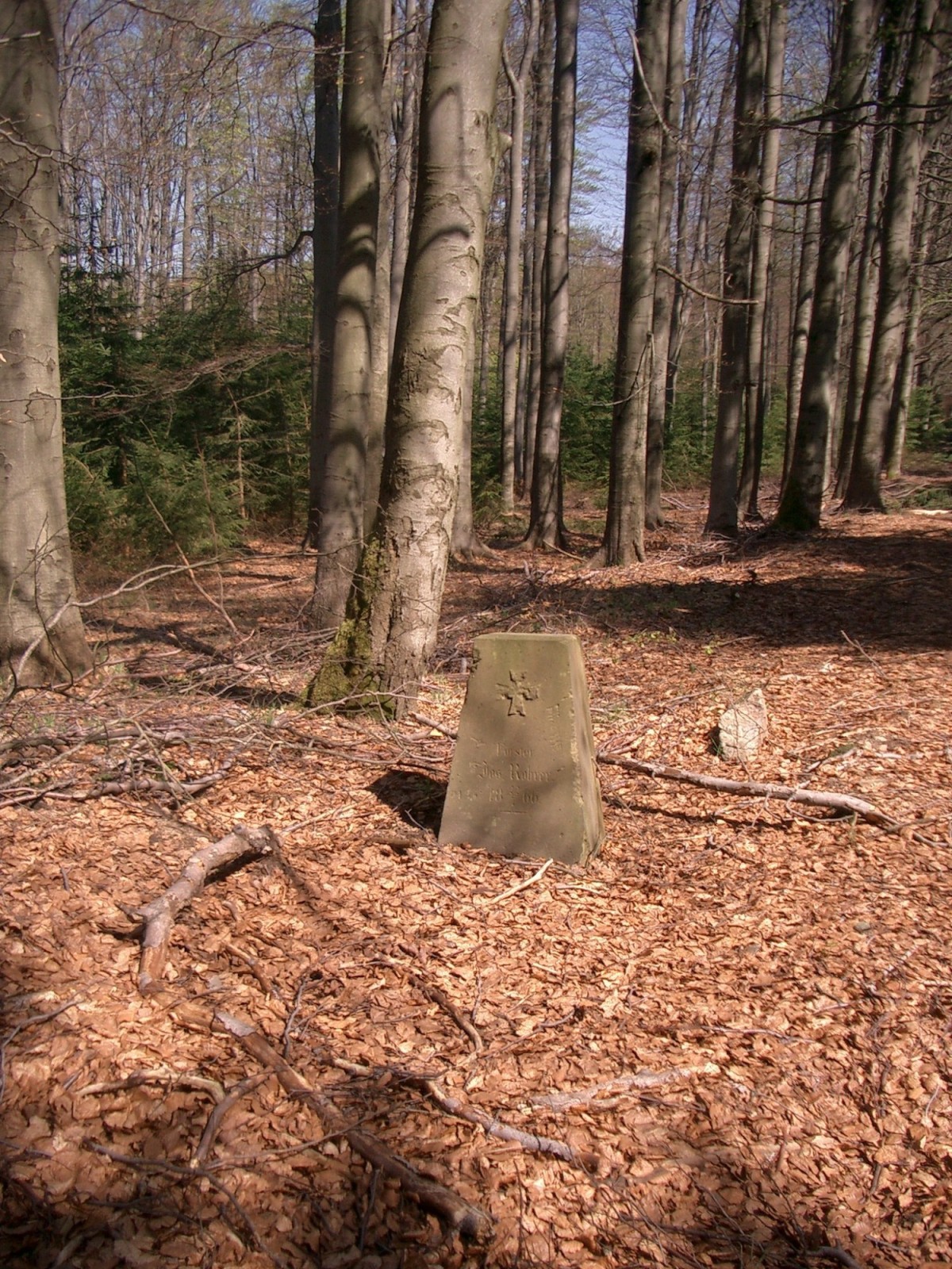 Vydali jsme se nazpět k rezervaci. Zahnuli jsme ostře vpravo a rozhodli se navštívit Rohrerův pomník. Leží bohužel uprostřed – zcela nové oplocenky rezervace. Otevřeli jsme si vrátka a po lesní cestě jsme se dostali k nazelenalému pískovcovému pomníku s křížkem a nápisem.