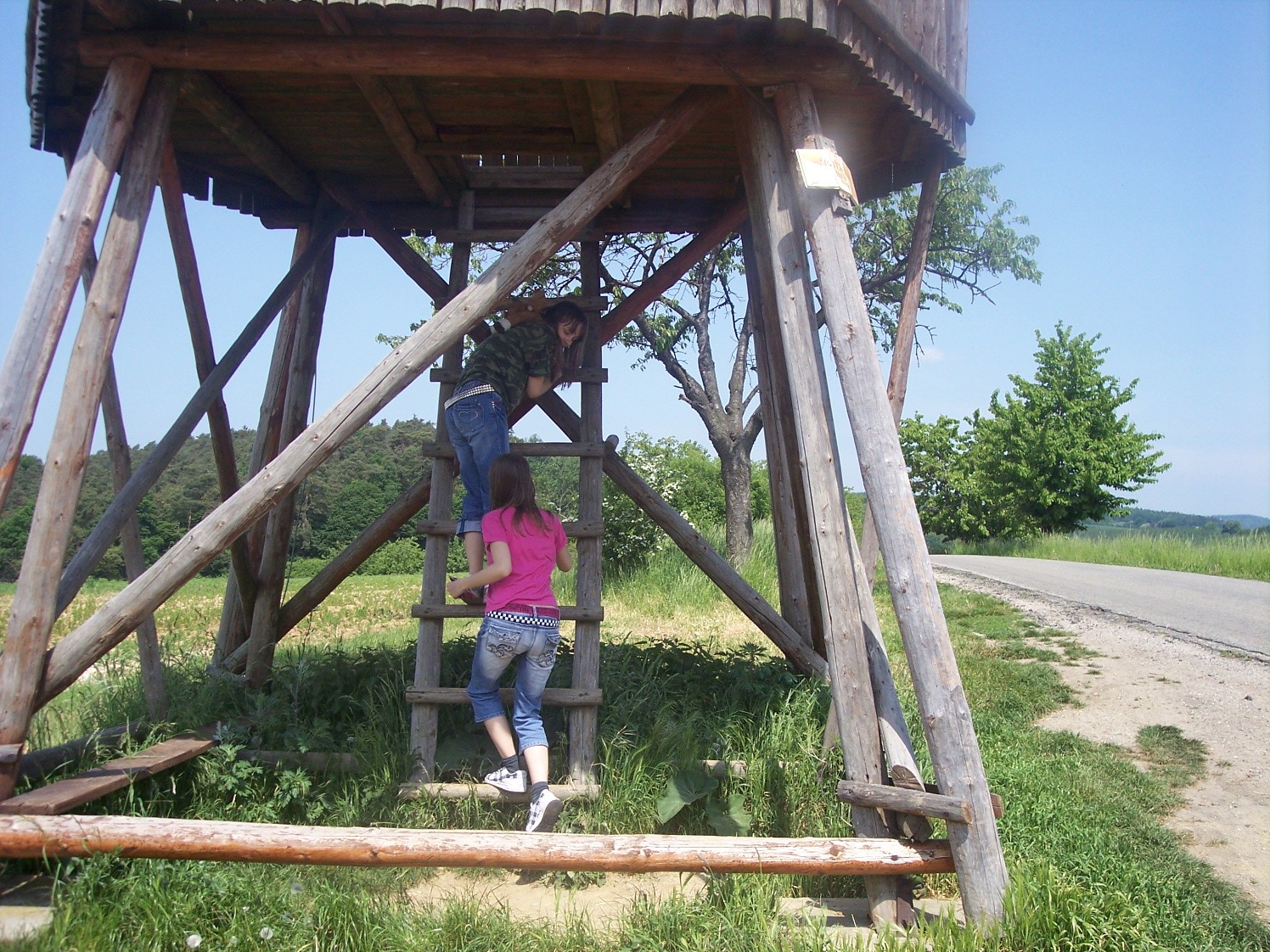 Nosnú časť rozhľadne tvoria štyri opracované drevené kmene, na ktorých sú umiestnené dnes už tri vyhliadkové plošiny, prvá vo výške 3,3 metra a druhá vo výške necelých 6 metrov. Táto rozhľadňa narástla v auguste 2003 ešte o jedno ďalšie poschodie, ktoré je kryté strieškou. Keď vystúpite po rebríkoch na jej najvyšší bod, naskytne sa vám z tejto pomerne malej rozhľadne pekný kruhový výhľad do okolia na Chřiby, Vizovické vrchy, Pálavu, Hostýnske vrchy, Uherské Hradiště, Zlínsko a Biele Karpaty. Nachádza sa vľavo od cesty nad obcou Modrá v smere na osadu Bunč. Je voľne prístupná. Dá sa pri nej zaparkovať automobil pre tých pohodlnejších, ale samozrejme sa tu turisti radšej premiestňujú po svojích, ale hlavne asi na bicykloch. Dievčatá vystupili na rozhľadňu bez problémov, manželka už má s výškou väčšie problémy, ale Modrá jej asi perfektne sadla, okomentovala ju: " Tak takéto rozhľadne mám rada, takéto mi vyhovujú. " Takže sa nám tu páčilo, je to pekné miesto.