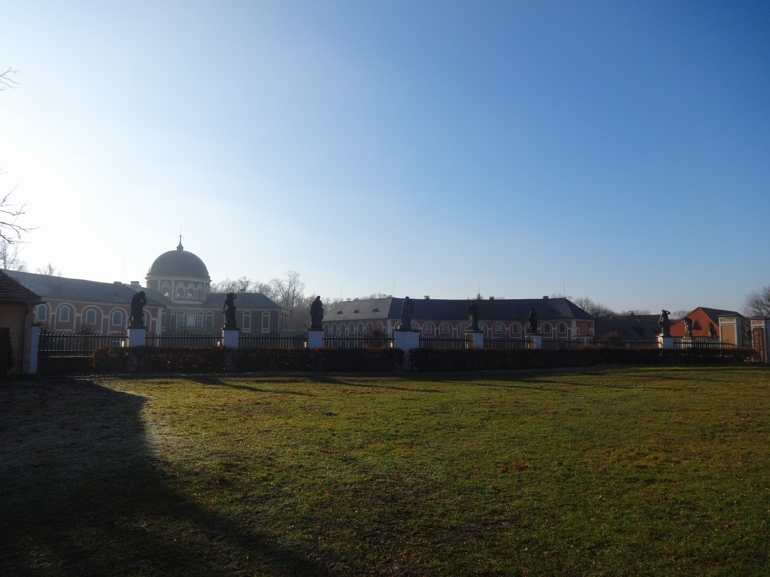 Soubor výškově odstupňovaných budov obklopoval dvůr. Hlavní budova přesahovala o výšku jednoho patra čtyři paprskovitě z něj vybíhající jednopatrová křídla, což tvořilo půdorysně ondřejský kříž. Dvůr byl na severu uzavřen řadou alegorických soch, představujících měsíce a roční doby. Jejich autorem byl Matyáš Bernard Braun.