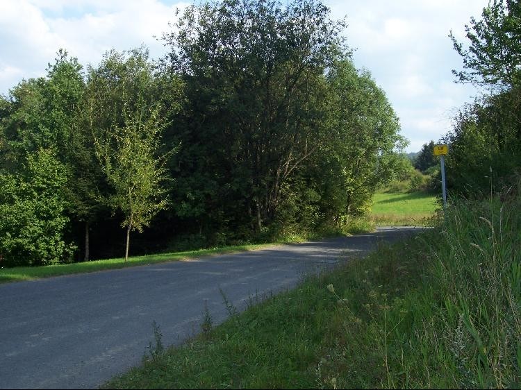 Rozcestí červené a žluté turistické značky na jihovýchodním předměstí Valašského Meziříčí.